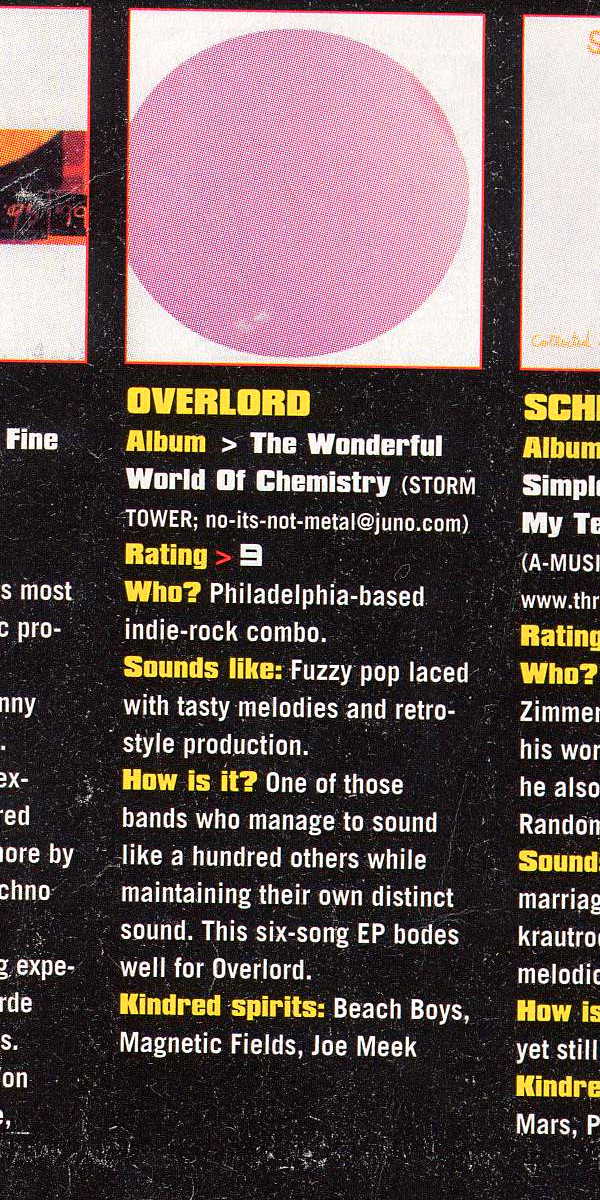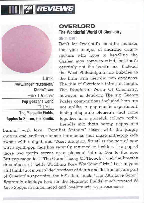 ALTERNATIVE PRESS, December 2001: Review of The Wonderful World of Chemistry: "9 (out of 10)... This 6-song EP bodes well for overlord." Review by Todd Hutlock. Read here.