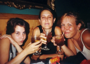 Liz, Maggie, and Chas with their drinks. Notice how Chas's straw appears to be going up her nose.
