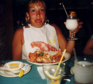 Here's Chas with her lobster at dinner that night. She is buzzed.