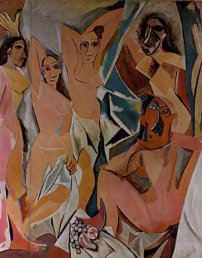 Nas figuras distorcidas das mulheres desnudas ele relfete seu interesse pelas esculturas africanas e italianas. Repare nossos planos e margens agudas resultantes do desenvolvimentodo Cubismo. O trabalho a seguir foi efetuado entre 1.909 e 1.910, durante a fase do Cubismo. Em suas pinturas com Cubismo, Picasso trabalhava com Braque, um artista muito popular naquela época. A tela abaixo apresenta uma particularidade muito especial, pois a figura da direita foi pintada por Braque.