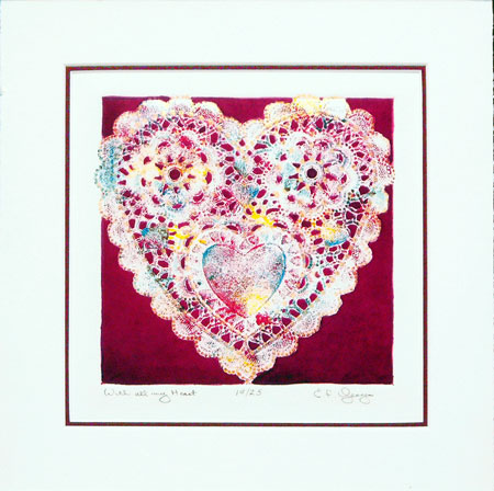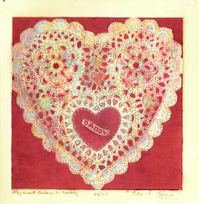"My Heart Belongs To Daddy" Click here to enlarge image ![]() One-of-a-kind Original Prints Monoprints Images 6 x 6" Matted to 10 x 10" with 1 ½" White or Ivory Mats ~~ $ 50 ea Wood Framed ~~ $ 75 ea Order Form How to Order |