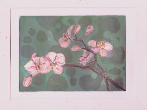 One-of-a-kind Original Print Monotype Individually Watercolored Prints Etching and Aquatint Image 12 x 12" Matted 17 x 17" Pink Hand Covered Paper Circle Mat ~~~ $ 100 Gold Leaf Wood Frame ~~~ $ 190 Order Form How to Order |