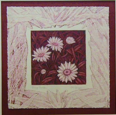 Daisy Garden Rose A One-of-a-kind Original Print Monoprint Etching, Aquatint & Collagraph~~$ 120 Color Burgundy and Rose on Ivory 100% Rag Paper Matting 15 x 15" Conservation Mounted and Matted Float Mounted on Burgundy Bottom Mat 2½" Ivory Top Mat Order Form How to Order |