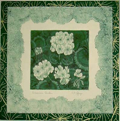 Geranium Garden Cool Green A One-of-a-kind Original Print Monoprint Etching, Aquatint & Collagraph~~$ 135 Color Cool Green on White 100% Rag Paper Matting 13 x 13" Conservation Mounted and Matted Float Mounted on Dark Green Bottom Mat with Hand Drawn Gold Geranium Leaves 1½" White top mat Order Form How to Order |
