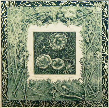 Geranium Garden Sage A One-of-a-kind Original Print Monoprint Etching, Aquatint & Collagraph~~$ 145 Color Sage Green on Ivory 100% Rag Paper Matting 15 x 15" Conservation Mounted and Matted Float Mounted on Dark Green Bottom Mat with Hand Drawn Gold Geranium Leaves 2½" Ivory Top Mat Order Form How to Order |