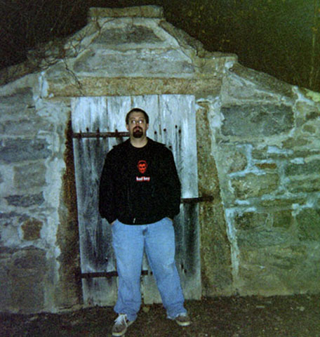 Larry A. Mauk standing in front of the building where "vampire" Mercy L. Brown's corpse was kept for the winter before it could be buried.(Halloween 2004)