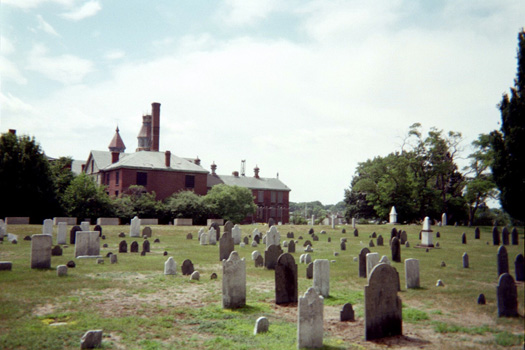 Salem, Massachusetts. (The graveyard where Giles Corey, an alleged witch, was "pressed" to death during the hysteria. In the background is an adandoned prison that was gutted by fire and is now supposedly haunted!) (photo by Larry A. Mauk)