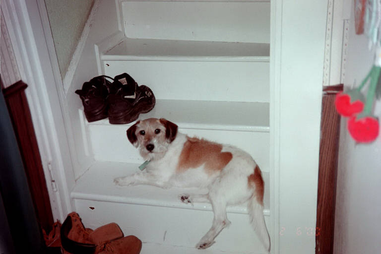 This is my dog sassy. She is laying on the steps in my parents kitchen. She's such a ham. She loves getting her picture taken. I used to dress her up and everything!!