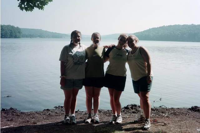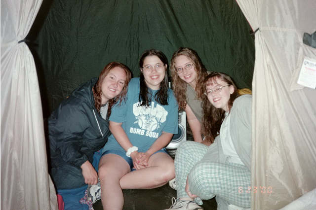 This picture is when me and my friends all went camping one summer. We had so much fun. We really roughed it too, with only tents, no running water, etc. It was fun. Of course we had guys with us, just in case we got scared!!! I am the one of the far left, then its Toni, Heather, and Rose.