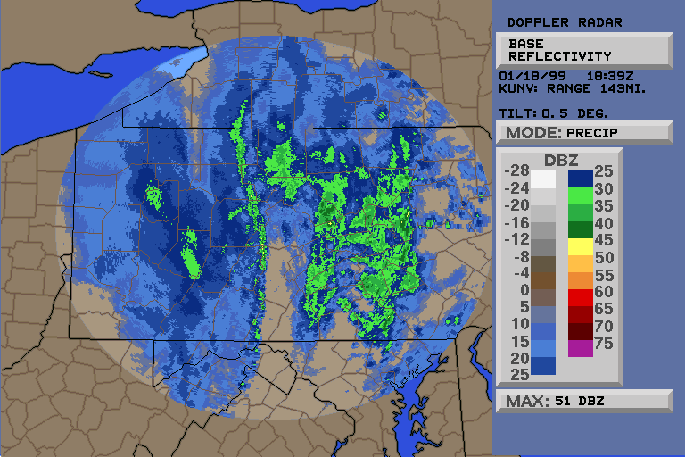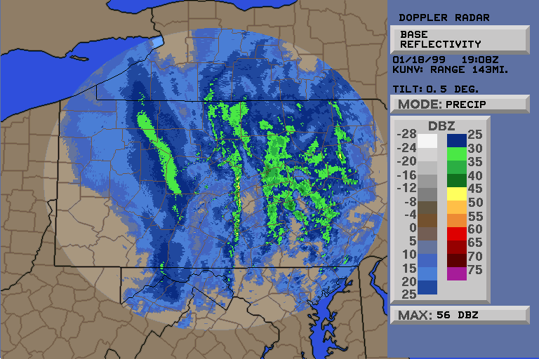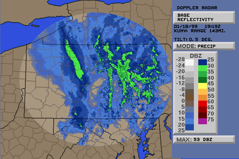 NCFR -- January 18, 1999 -- Rare Winter-time Severe ThunderstormsBanded precipitation, in the form of rain, started well before dawn over Pennsylvania. The periods of rain, some on the moderate to heavy side, continued through the morning hours. During the late morning, a Narrow Cold Frontal Rainband (NCFR) started to get its act together in western PA. It intensified quickly into a damaging squall line, producing damage before noon-time in western PA. The NCFR continued its movement in an easterly direction across central and eastern PA, then into New Jersey and off the Middle-Atlantic coast by early evening. It produced damage along its entire path. Although this damage was widespread in that it covered a fairly large amount of real-estate, the damage in that large area was not what you could call widespread, compared to spring and summer-time severe weather events. There was sizable gaps between damage reports. Nevertheless, very rare January severe thunderstorm and even tornadic activity occurred. This NCFR was expected, more-or-less. Damage occurred a bit farther west than SPC thought, as shown in their day-1 convective outlook, but they had a good handle on things. The overnight forecast discussion written by the NWS-CTP, quite a few hours before the severe thunderstorms occurred, gave indication that there was fairly high confidence with forecasting severe weather in January. As you might expect, instability was not very great. LI's were well above zero, as high as 10-15 in some cases. CAPE values were generally up to 500, which is not very high at all. The strong winds (60+ knots) just a short distance above the ground is what caused the thunderstorms to be severe. Any convection that formed was able to drag, or "mix", these strong winds down to the surface. Temperatures varied across the state. Upper 30's to low 40's was all that could be reached (despite WAA) in parts of the Susquehanna valley, which is where I live. The high temp at this house just north of Watsontown was 39 degrees. Some areas of the Susquehanna valley managed to get to the upper 40's, but it was brief and most of the time it was cooler. Temperatures in eastern PA, however, soared into the 50's. Philadelphia came in with 59 and Allentown 56! Dew points were just a few degrees, if that, lower than temperatures... so the air was very moist for January. SPC did not issue any severe thunderstorm watches for the region during the event. Local NWS offices of course issued warnings though, as needed. Radar images will be provided below. Generally, you will not notice widespread, exceptionally high DBZ values along the NCFR. This is because hail was kept to a minimum, and of course hail causes high radar returns (echoes). There was only one report of large hail, of dime size, which fell in eastern Centre county. There was several other reports of small hail, the size of peas or marbles, throughout the state... but even that was kept to a minimum. The main feature was wind damage. When looking at the reflectivity radar image from 1:39 PM, you'll note the NCFR just west of the radar dome, or just about in the center of the picture. Although it doesn't look impressive, an F1 tornado was produced minutes ago in central Bedford county (bottom part of the line)! Actually, this part of the line looks the least impressive. DBZ values along the line were mainly in the 35-45 range, but you'll note some yellow colors embedded within the line, indicating DBZ's of 45-50. This is where small hail was falling. The 1:51 PM velocity radar image showed weak convergence along the southern part of the line, where the tornado was produced. Since this tornado was a gustnado, the rotation was very shallow and the radar beam was a few thousand feet above the ground at that location, which is why it didn't pick up the rotation well. But the white colors you see next to the greens would indicate that weak, and shallow, convergence. With lines of thunderstorms showing this type of velocity pattern, it is common for short-lived gustnadoes to spin up at random along the line with no warning. This is why the phrase "severe thunderstorms can and sometimes do produce tornadoes with little or no advance warning" is included in some severe thunderstorm warnings. Rotation with mesocyclone tornadoes is usually detected sometimes 20 or more minutes before the tornado actually forms. Reflectivity data from 2:08 PM shows the line at its weakest again over extreme southern PA, in central and southern Franklin county. Yet, another gustnado was sighted a few miles east of Waynesboro, in Washington township (Franklin county). Windows were blown out and trees were down... with winds up to 70 mph estimated. Dime size hail was being produced around 2:20 PM in Millheim, Centre county. Radar at about that time showed the strongest DBZ values over over Millheim... indicating where the largest hail was likely. The severe thunderstorms continued moving east into the Susquehanna valley, where they weakened somewhat, but not entirely. This weakening is likely due to much cooler temps in the valley than outside the valley, like in eastern PA. Once the storms moved east of the valley into warmer air once again, they regained their strength. Still, in the mid Susquehanna valley, almost everyone experienced wind gusts to 40 mph... with some areas having gusts over 50 mph. On I-180 in southern Lycoming county, I received reports of several cars almost being blown off the road by thunderstorm winds around 50 mph. In this backyard (just north of Watsontown) I recorded winds to 40 mph. Trash cans were airborne for several feet, and then rolled even farther. One of them narrowly missed seriously injuring a dog standing nearby. The severe thunderstorms moved through New Jersey and Long Island causing more damage, but it was isolated in nature and few people saw severe wind gusts... although most people saw wind gusts to around 40 mph as the line of thunderstorms passed through. 