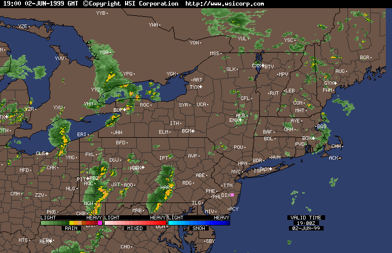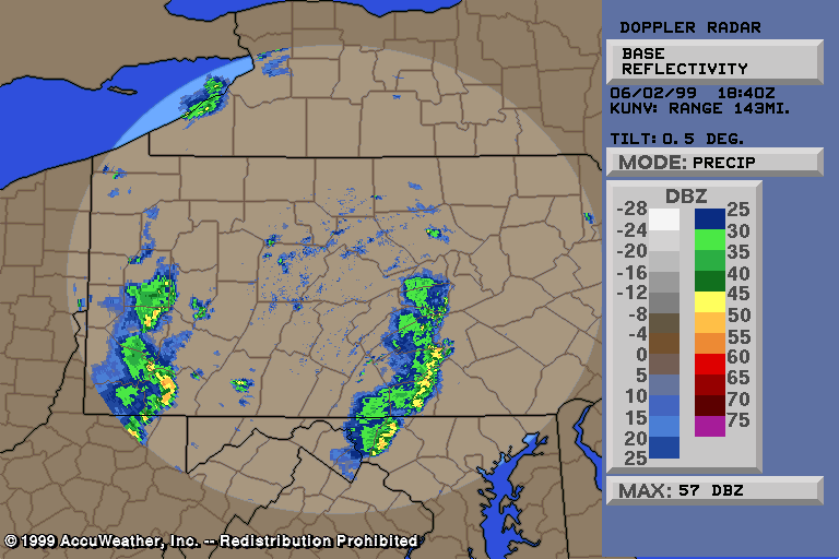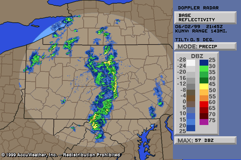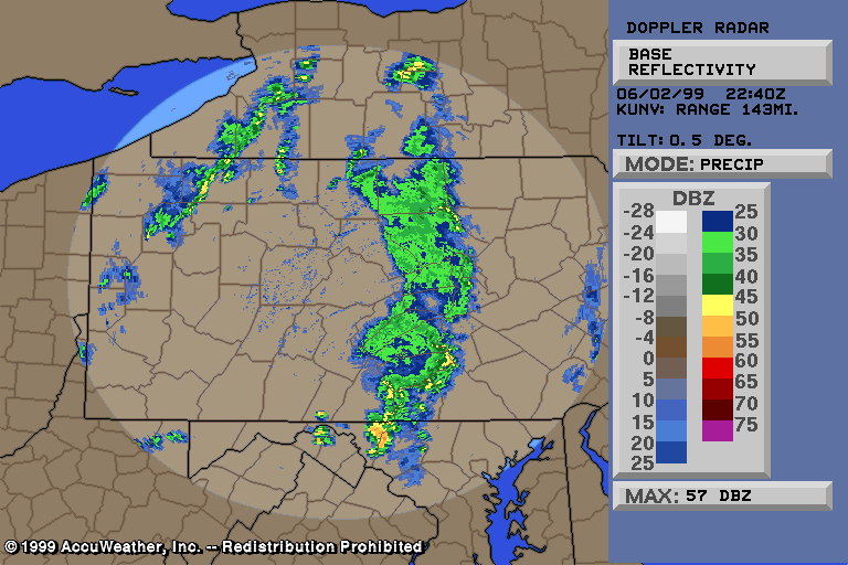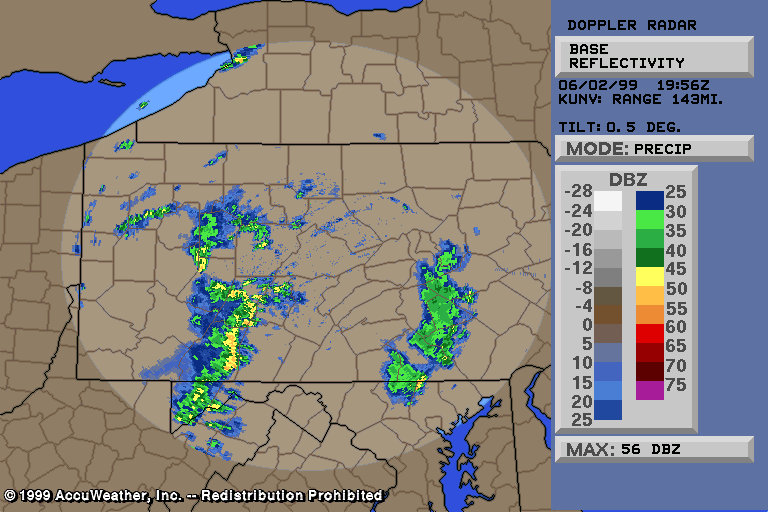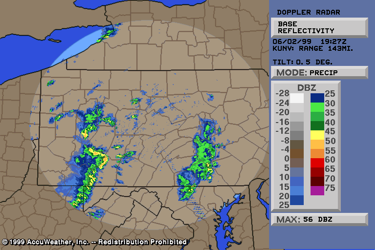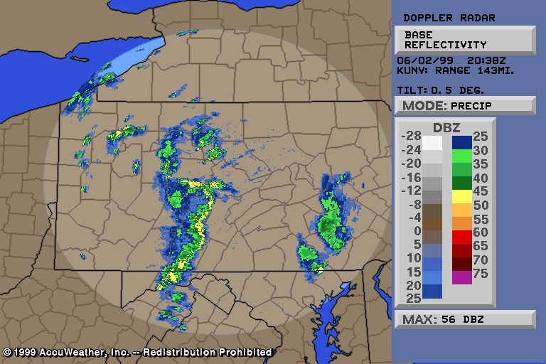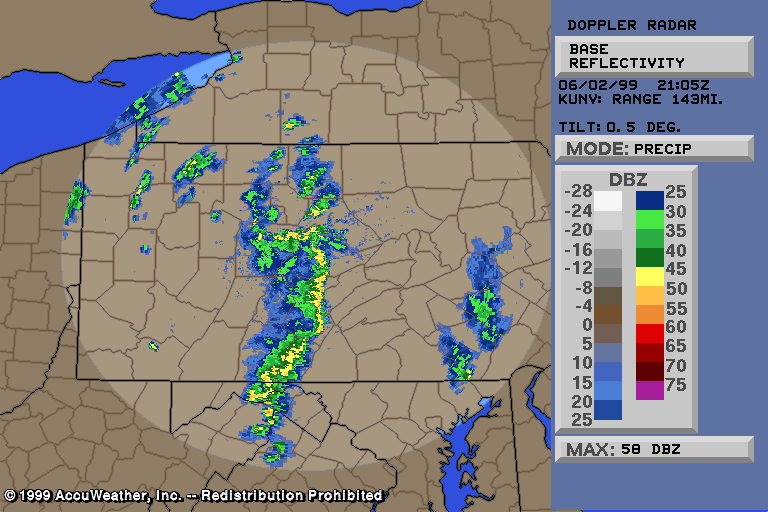 June 2, 1999, Severe WeatherThree main lines of convection formed on Wednesday, June 2, 1999. The atmosphere across Pennsylvania was slightly unstable... with CAPE values generally between 200-600 J/kg, and LI's mostly between -2C and -3C. Surface temperatures were in the 80's... and dew points (measure of humidity) were in the 60's. So, the air was fairly moist and muggy. The first and second band of convection formed well ahead of a cold front... which was positioned in Ohio during the afternoon. The third line was near (just ahead of) the cold front. You can see the NWS Local Storm Reports (LSR) here. The first produced isolated, marginal, severe weather across a few areas of south-central PA and the lower Susquehanna River Valley. The first five reports in the NWS State College LSR issued (linked above) show the damage from this first line of storms. The second line of thunderstorms was by far the most severe... producing numerous occurrences of damaging thunderstorm winds from southwest and west-central PA to the Susquehanna Valley. Most of the damage was west/southwest of State College. East of State College, or east of the main central PA mountain range, into the Susquehanna Valley... the thunderstorms weakened into mostly showers. Damage was more widely scattered... with wind speeds marginally severe... and damage occurring along the leading edge of the line of convection. As said above, the worst damage from these storms was west/southwest of State College. In southeastern Armstrong county, violent thunderstorm winds, deemed as a microburst, caused significant damage in a section of Plum Creek Township... near Elderton. 1 house was completely destroyed... and 4 others damaged quite a bit, which includes roofs ripped off and structural damage. 10 other homes had more minor damage, and 2 vehicles were damaged. Unfortunately, there was an injury. Numerous trees were snapped and uprooted along the 3 mile long damage path. Thunderstorm winds were likely 75-100 mph, per NWS survey. Numerous other reports of severe weather were received across the Laurel Highlands. Cambria county appears to have the most widespread damage... but damage also occurred in surrounding counties. See LSR's for details. The third line of showers and thunderstorms was the weakest of the three lines. One report of severe weather was received from north-central PA... in McKean county (this is shown as the last report on the NWS State College LSR). The following radar images are available from this event: 2:40 pm reflectivity data shows the first line of storms crossing the Lower Susquehanna Valley (with some showers stretching into the Mid Susquehanna Valley). Also take note of the second line of storms forming in southwest PA. 3:03 pm reflectivity data show the line of storms in the Lower Susquehanna Valley weakening further... while the storms over southwest PA continue to strengthen and take shape. You'll notice the bowing section over southern Westmoreland county to near the Somerset county border. 3:03 pm echo tops data shows thunderstorm tops around the bow echo area in SW PA growing... while the tops with the convection in the Lower Susquehanna Valley lower with the weakening convection. 3:27 pm reflectivity data shows the storms continue with the embedded bow echo causing most of the damage. 3:44 pm reflectivity data. 3:56 pm reflectivity data. 5:00 pm reflectivity data. 5:05 pm reflectivity data. 5:25 pm reflectivity data. 5:45 pm reflectivity data shows the line weakening with time as it moves east. 5:45 pm velocity data shows that very gusty winds, still causing some damage, are present along the leading edge of these storms. The radar scan by the Union/Snyder/Centre/Clinton county borders, where the strong winds are shown, is roughly 3,000 feet up. Thus, radar shows that wind is occurring at that height.. not at ground level. But as is fairly frequently the case with storms like these, a lot of that wind is mixed to the ground. 6:40 pm reflectivity data shows that the convection has weakened significantly more... below severe limits... although gusty wind was still occurring along the leading edge of the line. Regional radar loop from 3-8 pm shows the three main lines. Go here for a complete listing of all images/text available for this event. Included are additional radar images not linked above and warnings issued.