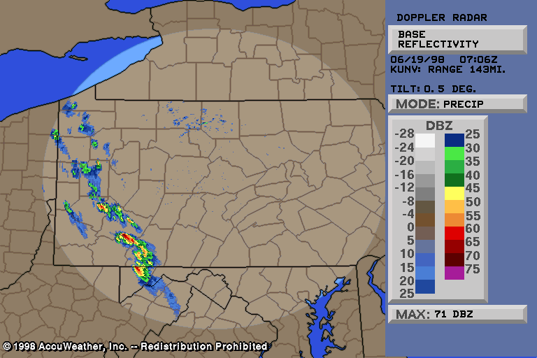 As you can see on the 0615Z (2:15 am) regional radar summary, thunderstorms were developing across western PA, ahead of the solid line of severe thunderstorms just entering western Ohio (which had a long history of wind damage). A short while ago, there was absolutely nothing in PA, with clear skies. Note that radar indicated HAIL with the storms in PA. Still, no warnings were issued. The thunderstorms started to really intensify around 0630Z (2:30 am), virtually out of no where. If I was in charge at the NWS, I would have put out a warning about now for southern Somerset county. Notice the 66 dbz! Keep in mind that this is in the middle of the night (not to mention in PA). Very unusual. I waited for several minutes, wondering why a severe thunderstorm warning had not been issued yet. Finally, at 2:47 am (0647Z), the State College NWS office issued a severe thunderstorm warning for Somerset county. As seen on this 0700Z (3 am) radar image, the storms intensified some more, now reaching 69 dbz! 6 minutes later, I couldn't believe what the radar showed - 71 dbz!! 2 minutes later, the NWS in Pittsburgh issued a severe thunderstorm warning for Westmoreland county. The Infrared satellite at 0715Z (3:15 am) showed the storms in PA nicely. Notice the bright white clouds over western PA and northern West Virginia... and then notice the clear skies over the rest of PA. The bright white clouds show where the highest cloud tops are, thus showing thunderstorms, since they grow very high into our atmosphere. Nickel size hail (.88") was reported in sections of Westmoreland, Fayette, and Somerset counties, and quarter size hail (1.0") fell from Beaver Falls to Beaver... in Beaver county. It is likely that even larger hail, maybe up to golf ball size, fell in isolated locations but went unreported because of the time of night. Half dollar size hail was reported as the severe thunderstorm moved into northern West Virginia... still in the NWS-PIT CWA. The only reported wind damage occurred in Beaver county, near the town of Beaver Falls. For some reason, no severe thunderstorm warning was issued for Beaver county. The damage occurred around 520 am, and was due to a microburst from a thunderstorm. Many trees were snapped or uprooted, two telephone poles were snapped, power lines were downed, a few roof shingles were ripped off a couple houses, and a porch was torn right off a house. Maximum winds were around 80 mph at the microbursts peak intensity, but around 70 mph for most of the time. The width of this microburst was 350 yards (1050 ft) and the length 700 yards (2100 ft). Due to the torrential rain associated with the thunderstorms, flash flooding started. A few flash flood warnings were issued by both the CTP (state college) and PIT (Pittsburgh) offices. A mudslide occurred in Westmoreland county due to heavy rain. Also, streams were out of their banks, with some evacuations needed. Many basements were flooded, and roads were closed.