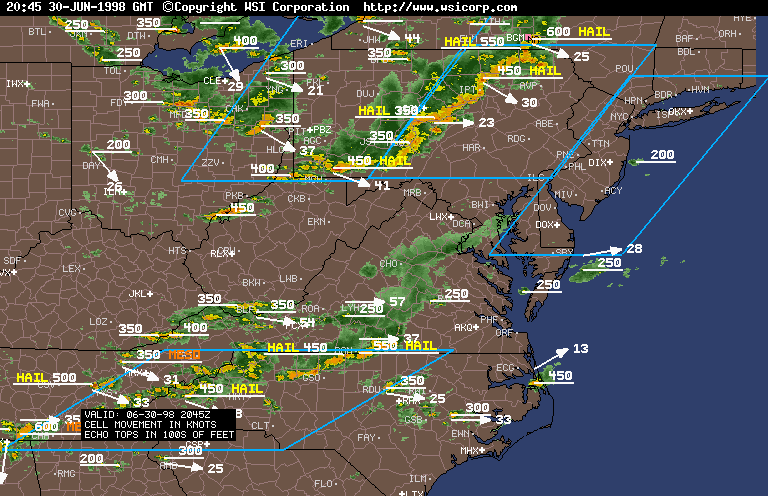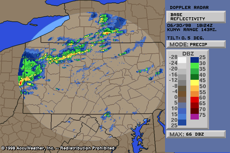 Severe Weather of June 30, 1998Severe weather raked eastern Ohio, southern New York, and much of Pennsylvania during the afternoon and evening hours of June 30, 1998. Isolated areas in Maryland, West Virginia, and Connecticut also experienced severe weather. The storms started to really intensify shortly before 2 pm, in northwest PA and northeast OH. A cold front was draped across OH and northwest PA by mid afternoon. A warm front passed through yesterday, bringing in the unstable airmass. During the afternoon today, LI and CAPE values were enough to support severe thunderstorms, but not tremendously impressive. SPC had us in the usual slight risk, however observed reports after the event were closer to moderate risk criteria. The NWS-CTP (State College office) issued this severe weather outlook, stating the severe weather threat. A severe thunderstorm watch was issued for the western half of PA around 1 pm, and for the rest of PA shortly before 3 pm. Numerous severe thunderstorm warnings were issued for OH, as well as several tornado warnings. The Canton/Akron airport recorded an 84 mph thunderstorm gust. Large air conditioners were ripped off roofs at the airport. Some houses had roofs ripped off, trailers were overturned, and boats at an area lake were flipped upside down. Two houses under construction were flattened. Trees and powerlines were downed in several counties. The storms formed into a line as they moved into PA, resulting in severe thunderstorm warnings being issued for 51 of Pennsylvania's 68 counties. Fairly decent damage occurred in some areas, mostly to trees, but structures were also damaged or destroyed. Several statements were issued for some of the damage reports. Beaver, Butler, Armstrong, Indiana, Washington, and Fayette counties: Dime size hail fell in Farmington, Hopwood (Fayette county), and 2 miles southeast of Shippingport (Beaver county)... while quarter size hail fell in Hookstown (Beaver county), where a couple trees were also blown down. A large tree was blown onto route 68 in Butler, and trees/large limbs were downed in Sarver (Butler county). Two houses and a car were damaged by the falling trees in Sarver, and a car and house was hit in Blairsville (Indiana county). Trees and lines were also downed in several areas across Armstrong and Washington counties. Power was out to portions of Beaver county for over 2 days! Westmoreland county was hit hard, with countless trees and powerlines down across the county. Some trees blocked roads, and fell on houses and cars. A house in Greensburg had its roof torn off, and a barn 10 miles north of Latrobe was destroyed... by thunderstorm winds. In New Kensington, trees and lines were down, power/telephone poles were snapped, and a brick wall collapsed. In Bolivar, there was 65 mph thunderstorm gusts with trees down. In Murrysville, thunderstorm winds caused extensive damage. Numerous trees and power liens were blown down. A new concrete block wall at a car dealership was blown down. At least 10 homes suffered major damage, with countless other homes reporting moderate to minor damage. Minor damage would include broken windows, and stripped siding, gutters, and roof shingles. Maximum winds within this thunderstorm microburst, in the most severely damaged areas, were likely 90-100 mph! Damage in Murrysville alone was about $1 million. In Allegheny county, widespread tree and power line damage occurred also. A roof was ripped off a house in Monroeville by the thunderstorm winds. Nearby houses also suffered damage, and trees were downed. The Pittsburgh International Airport recorded a 62 mph peak wind gust, with minor damage observed. Golf-ball size hail fell in Imperial (trees were downed and a few homes were damaged in Imperial too). Dime size hail fell in Pittsburgh. Trees and lines were down in Verona, along with nickel size hail. In Penn Hills, a 75 foot tree was ripped out of the ground. 50-75 other trees were downed in that area, with many roads blocked. As one person put it: "There's trees down everywhere. You would think a tornado came through here." A car was crushed in Pittsburgh by a falling tree. Numerous trees fell on houses. In the North Hills section of Pittsburgh, a microburst hit, with a width of 1-2 miles and a length of nearly 5 miles. Many trees and powerlines were brought down by the wind, some landing on cars and houses. Many residents reported structural damage to their homes. The hardest hit place was the Larouche College area, where significant window and roof damage occurred. The roof of a McCandless convent was ripped off, causing injury to three nuns. In total, 10 injuries were reported with this severe thunderstorm across the damaged area. Just north of Pittsburgh, one township had so many trees down that it took 3 weeks for them to be completely cleared!! Thousands of people didn't have power for days! Damage was just so widespread and locally quite significant. This made the damage total for Allegheny county alone very high -- more than $40 million!! Warren, Mckean, Cameron, and Tioga counties: Marginally severe thunderstorms moved across this area... dropping large hail and downing trees/lines. Dime size hail fell in Sheffield, while nickel size hail fell in Bradford and Rew. Trees were blown down by thunderstorm winds onto route 6 two miles east of Kane, and in Emporium, Sinnamahoning, and Wellsboro. There was also trees down in other remote areas, mainly across Tioga county. Clearfield, Cambria, and Blair counties: Thunderstorm winds blew down trees in a few areas across these counties... including north of Du Bois (Clearfield county), throughout the city of Altoona, and in Ebensburg (Cambria county)... where a tree fell on a car. In west central Cambria county, a gustnado of F0 strength spun up within a larger area of downburst damage. The tornado/gustnado started in Vintondale and traveled east into the town of Nanty Glo... a length of about 5 miles. The width of the tornado was no m