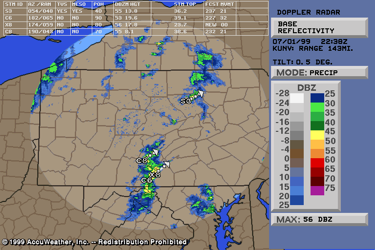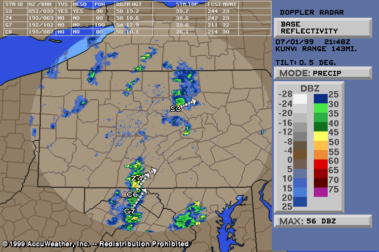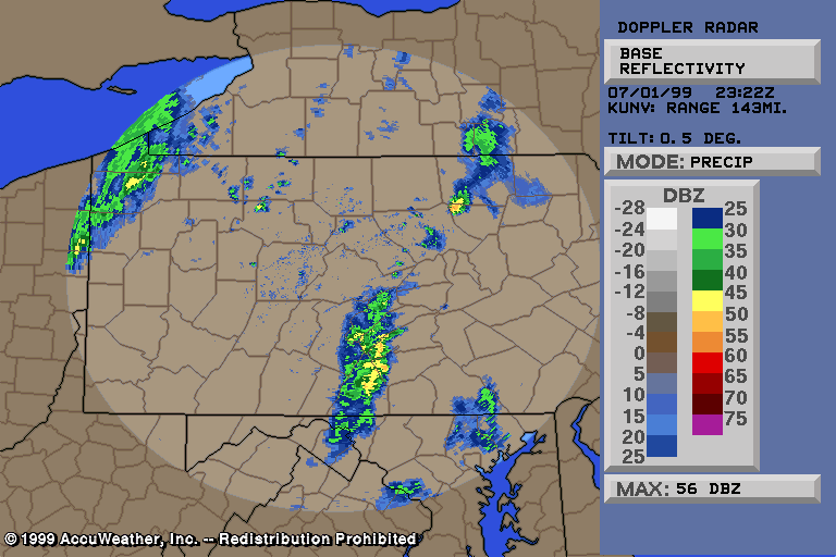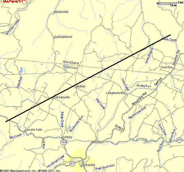Tornado of July 1, 1999An isolated, small supercell thunderstorm developed in Clinton county during the late afternoon... and tracked northeast for over 60 miles before dissipating. The actual thunderstorm developed even farther southwest than Clinton county... in Clearfield county... earlier in the afternoon... but only started to show supercell characteristics in Clinton county. At 5:48 pm, the Storm Information Table (SIT) overlaid on the reflectivity data indicated not only the presence of a mesocyclone within that thunderstorm near the Clinton/Lycoming county border... but also a Tornado Vortex Signature (TVS)! This shows a more persistent and tight rotation within the thunderstorm... and indicates a strong likelihood of a tornado. Very large hail was not a threat with this storm... and you'll note on the SIT data that radar indicated a max DBZ of just 58 at that time, located in an elevated layer around 19K feet. At 6:38 pm, the SIT still indicated a mesocyclone and TVS. When the storm was on the Lycoming/Sullivan county line... echo tops data at 7:17 pm showed the storm extended very high into the atmosphere. Also, SIT data from same time shows the storm still contained a mesocyclone but radar did not detect a TVS any longer. Don't let that be deceiving though, as the storm was beginning to produce a tornado at this time. Reflectivity data at 7:22 pm showed the storm. It doesn't look that intense here... but a tornado was on the ground now in northwest Sullivan county with this rotating thunderstorm. A few minutes later, at 7:28 pm, about when the tornado was lifting back into the thunderstorm... the Storm Relative Mean Radial Velocity (different than the Base Velocity) showed good rotation with this mini-supercell. It can be seen much better by a zoomed-in view. The tornado touched down in northwest Sullivan county near the Fox/Elkland township line... and tracked northeast for approximately 5 miles. Exact length from the starting point is nearly impossible to determine because of the very remote, forested area that it initially touched down in. Width was around (or a bit over) 600 feet (about an 1/8 mile). This tornado was spotted by a few people... and it may have had multiple vortexes (despite how rare that is with "weak" tornadoes)... indicated per both visual reports and damage surveys. Specifically, the tornado touched down about 1.5 miles northwest of the village of Lincoln Falls... just south/west of State Route 154 in Elkland township, about a 1/2 mile from the Fox township line. It crossed quickly over SR 154... snapping and uprooting dozens of trees, many large, along the road and to either side. For a few example, see pictures one, two, and three. The tornado tracked east-northeast for about a 1/2 mile down a hill into a valley with a creek, and then up the other side of the hill... taking down a swath of trees. As it reached the top of the hill, it crossed McCarthy Ridge Road (TR 424). This is where the most extensive damage occurred, and will be described below with numerous pictures I took when doing the survey. Most damage was from the corner of McCarthy Ridge Road and SR 4008 southward for a little over a 1/4 mile down the road. Along and to either side of McCarthy Ridge Road, many trees were downed (such as these)... small and large. At one home, a part of the roof was blown off. That section was covered with a blue tarp when I arrived there the next morning after the storm to do the survey. At a nearby home, a porch was blown completely off the side of the house... with its debris scattered across the lawn. Even across the road, pieces of debris was seen... including part of a wooden chair which was destroyed as it flew through the air. Also at this home, debris hit a pickup truck... knocking out windows and denting it. At the home of Jim Rinker roughly about 1000 feet away, considerable damage was done to his property... which got the brunt of the tornado. Numerous (most) apple trees at his apple orchard were snapped or pushed over; see pics one and two. Hundreds, if not thousands, of apples were made airborne and thrown across his large yard, outside of the apple orchard. In some areas, the ground was completely covered with apples (in other areas there was just a few). In addition, numerous other trees on his property were snapped or uprooted. One large Colorado Spruce that was uprooted in the front lawn was lifted by a crane to be moved. Another large tree (a few feet in diameter!) was snapped like a toothpick... the two men in the picture are trying to cut it into pieces. Parts of trees and sheet metal debris were seen across his yard. His relatively old, very well built house suffered structural damage. As Jim and his wife ran downstairs as the tornado was approaching, he felt and heard the house shift. Sure enough, it did. Windows and doors bind as you try to open/close them, as the whole frame structure of the house was twisted... not noticeable just from taking a glance at the house. In addition, several pieces of asphalt roofing shingles were ripped off his roof, and could be seen scattered across the area. A large, sturdy, TV antenna was also ripped off and came to lay by the side of the house. Two windows were broken, either from the wind or flying debris, and a couple pieces of aluminum siding were ripped off. There were several dents and gouges in the siding around the house... made by flying debris. One piece of wood that was airborne was embedded into another piece of wood just under the roof of his porch!! His house was about the only thing that is salvageable out of his entire property. He lost many of his trees, apple or otherwise, and two other large structures were wiped out. The first was a very large barn which was demolished (see pictures one, two, three, and four). A couple large chunks of the roof were thrown several feet TO the north. Numerous other pieces were thrown in other directions, including across the street. A pickup truck ca