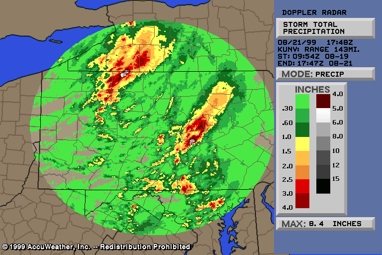 August 20, 1999 Flash FloodingThere were two areas of flash flooding on this day; McKean county in northwest PA... and the part of the Mid Susquehanna Valley in central PA. Several inches fell in some areas over those two locations... while other areas of Pennsylvania saw little rain at all. A Storm Total Precipitation from Doppler Radar estimates is available. Not the two areas of extreme rainfall (in a short time too!). Doppler radar actually was underestimating rainfall in some areas. For example... where I live in extreme northern Northumberland county... a few miles north of Watsontown... I received 4.30" of rain. Radar estimates are quite a bit lower for my area. The borough of Lewisburg, Union county, was hit by flash flooding. Numerous streets in town were impassable with as much as 4 feet of water on them!! In addition... parking lots, fields, and playgrounds were submerged in water. A college also had water damage. Several other roads in Union county were closed... including at least 3 in Mifflinburg. In Snyder county, numerous roads were also closed. Areas near the Snyder/Juniata county border were hit hardest. Roads were inundated with water... and several water rescues had to be performed by Authorities. Some buildings were damaged... and a mobile home was moved 15 feet off its foundation! Many basements had water in them... some measuring it in feet. But northern and western McKean county in northwest Pennsylvania were hit the hardest by far... with 7-10 inches of convective rain falling in a short time around the Bradford area!! This caused a MAJOR flash flood in that area. Streams and creeks went from near dry levels to raging waters well over their banks in literally just a few hours... the fastest rises occurring in less than an hour. The result of this violent flash flood was total chaos. Roads were obviously flooded with feet of water. In fact, a couple roads were entirely washed away. They're just gone... and have to be made over again. Buildings were damaged and destroyed... and cars and trucks were thrown downstream. The local area was like a war-zone. Preliminary damage estimates reach a staggering 25 MILLION dollars!! Approximately 700 homes and 50 businesses were affected. Even worse... 95% of the flash flooding occurred OUTSIDE of the "flood plains"... and just 1% of the damage is covered by insurance!! A complete listing of all images/text available for this event can be found here.