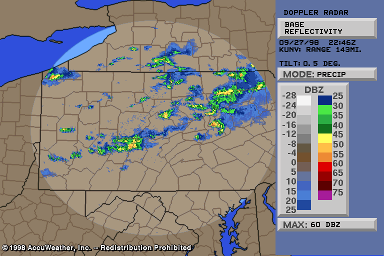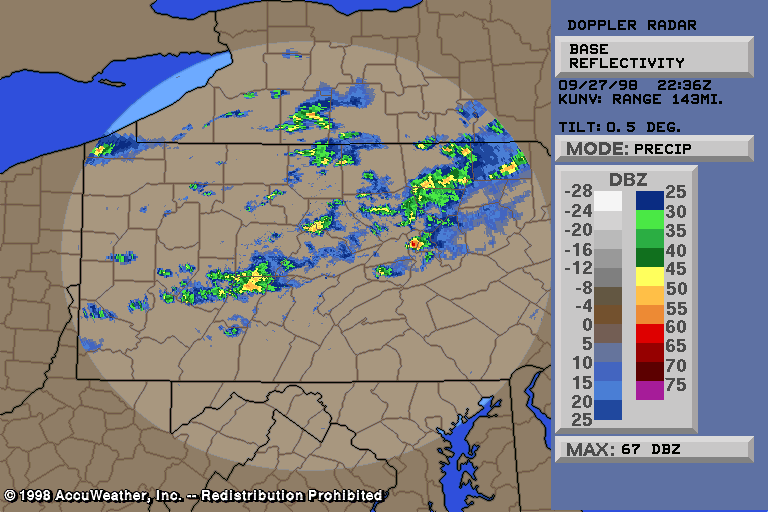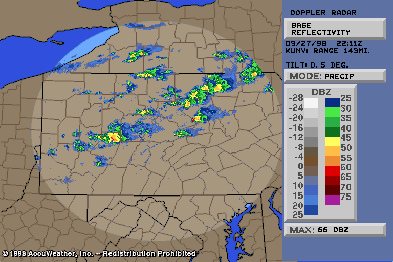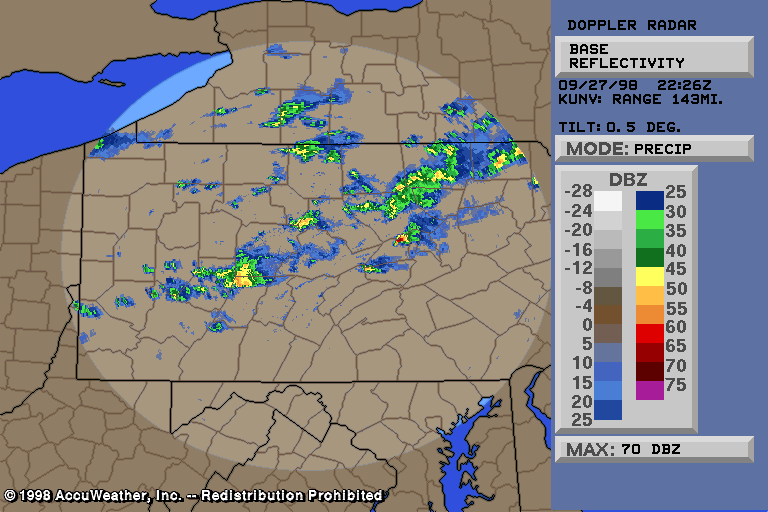 September 27, 1998 Severe ThunderstormsThunderstorms developed during the afternoon across portions of NY, OH, and PA... ahead of a cold front. The thunderstorms were not organized into a line, but rather scattered in nature. However, several still became severe, but by no definition widespread. There were a couple intense thunderstorms... with the most notable in the Middle Susquehanna Valley. One of these thunderstorms took on impressive Supercell characteristics (almost a "text-book" example)... with persistent rotation and high reflectivities. But, it didn't last as long as true supercells typically do. I guess to sum it all up, there was a smattering of damage across western and central PA, with the worst of it in the Middle Susquehanna Valley. This panned out well with SPC's slight risk forecast. As mentioned above, the thunderstorms were ahead of a cold front. An unusually warm and humid airmass was in place over PA and surrounding areas. Record high temperatures which had stood since the turn of the century were broken in several areas. Both Harrisburg and Philadelphia reached 91 degrees! Remember this is very late September. Other records were shattered at Allentown, PA, and Binghamton, NY, airports (where official readings are taken). The Wilkes-Barre/Scranton International Airport missed their record high by 1 degree. Dew points were in the 60's across Pennsylvania... showing just how humid it was for the northeastern U.S. while approaching October. There was several hours of sunshine during the morning and early afternoon, leading to destabilization of the atmosphere. CAPE's were up to 1,000 in PA, and LI's dropped to -5. Although neither number is impressive, especially the CAPE, they were enough to support severe thunderstorms. I think that the reason a solid squall line did not form is because of the non-impressive instability factors. Probably one of the biggest things that got the severe thunderstorms going was the soupy airmass (high dew points), and heating from the sun. Just a short time after sunset in the early evening, the thunderstorms decreased in intensity as they lost their power source. Thunderstorms developed first in southern New York State during the early and mid afternoon hours, and it took until 3:00 pm for storms to form in most of PA. A few of the thunderstorms in NY were severe, downing trees and power lines. One of the severe thunderstorms in westren NY dropped very large hail... actually some of the largest ever recorded in that part of NY. The largest stones (which were more than 3 inches in diameter - larger than baseballs!) were not able to be photographed. Still, pictures were taken of some of the large hailstones. Two of the severe thunderstorms in south central NY moved into northeast PA, namely northern Bradford and northern Susquehanna counties. Numerous trees and lines were blown down in Sayre, Athens, and Little Meadows. Large hail also fell in a couple spots, with radar reflectivities over 60. SPC issued a severe thunderstorm watch for most of PA around 3:30 pm, excluding the extreme eastern counties (also see redefining statement from CTP). The first severe thunderstorm warning in PA was issued for Clarion county in western Pennsylvania, at 3:52 pm. Severe thunderstorm warnings continued to be issued for other counties around western and central PA through early evening. One thunderstorm in Mercer county downed trees and power lines in the town of Mercer, and in Grove City... where dime size hail also occurred. One tree landed on a house and another on a porch. Large limbs were ripped out of trees in Dayton, Armstrong county, with dime size hail falling in Dayton and Templeton. Elk City in Clarion county had some damage from the severe thunderstorms, including trees down, a shed destroyed, and windows blown out of a house. Trees and lines were blown down in the town of Warren, with trees down in west central McKean county and DuBois as well. Potter county had trees and power lines blown down countywide. Hail as large as dimes fell in northwestern Butler county, namely Harrisville. Dime size hail also fell in Altoona, with trees down from the thunderstorm winds. A spotter in Plumville, Indiana county, reported winds to 60 mph from one thunderstorm cell. Zion in Centre county had tree limbs blown down, along with a few power lines. The first real notable damage occurred in far northern Cambria county, in west central PA. Thunderstorm downburst winds cut a 7 mile long, 1 mile wide swath of tree damage... starting just east of Hastings and ending east of Patton around St Augustine. A gustnado spun up within this downburst, as damage patterns in some areas indicate. Damage was somewhat scattered until just southeast of Patton, to St Augustine. Here, winds reached peak speeds of around 70-80 mph, causing extensive tree damage (more than a hundred were blown down). A 2100 gallon water tank was moved a 1/4 mile! One house roof was damaged from a falling tree outside of Patton. Just east of St Augustine, part of a barn roof was lifted off the rafters and set back down. Crops were flattened near the barn, with rotation shown in the field. A large pen filled with Game Pheasants sustained damage when plastic netting was ripped off and blown to the north of the pen. Some pheasants flew away, while a couple dozen were killed. Dime size hail fell in Hastings. Roads were also blocked from trees and power lines. Near the Clinton/Lycoming county border, areas around Avis and Jersey Shore were also hit by severe thunderstorms. Trees were down, power poles were snapped, and a roof was torn away from a house by the damaging thunderstorm winds. A tree damaged a house as well. Radar showed the severe storm at the approximate time of the damage. As the thunderstorm moved southeast into northeastern Union county, it became very intense and showed some rotation. A hook echo was even shown for a time. A tornado warning was issued at 6:16 pm for Union county. The t