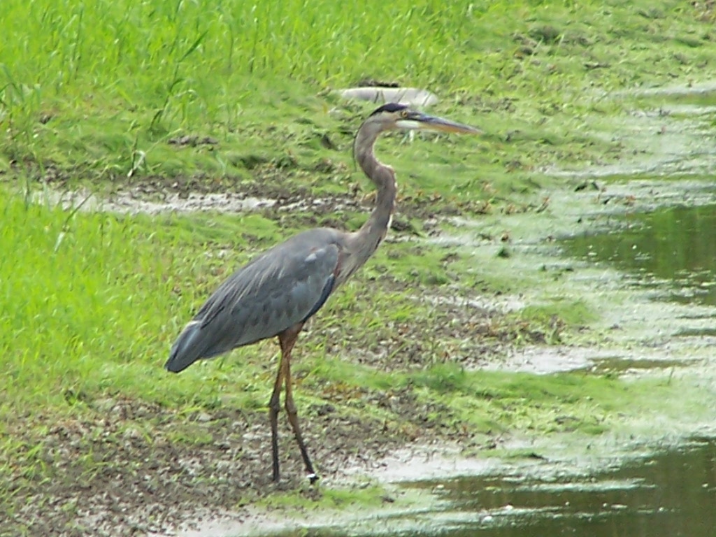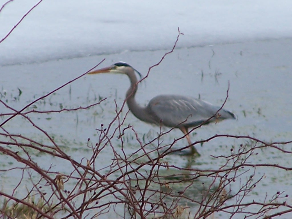 Great Blue Herons are commonly found around streams, ponds, and wetlands where they feed primarily on fish. The heron is an opportunist though. It will also eat frogs, snakes, crustaceans, and even mammals given a chance. The bird will wade into the water. With crooked neck it looks for a potential meal. When prey is spotted and within range, the heron thrusts out its neck like a striking rattlesnake. Smaller fish are caught in its snapping beak. Larger fish are speared with its sharp bill. The Great Blue Heron’s neck will stretch allowing it to swallow fish much larger than expected. And, while it is hard to measure a bird’s intelligence, the Great Blue has demonstrated that it can learn a few tricks. There have been many reports of herons stealing bread from dumpsters to use as bait to lure fish into range!