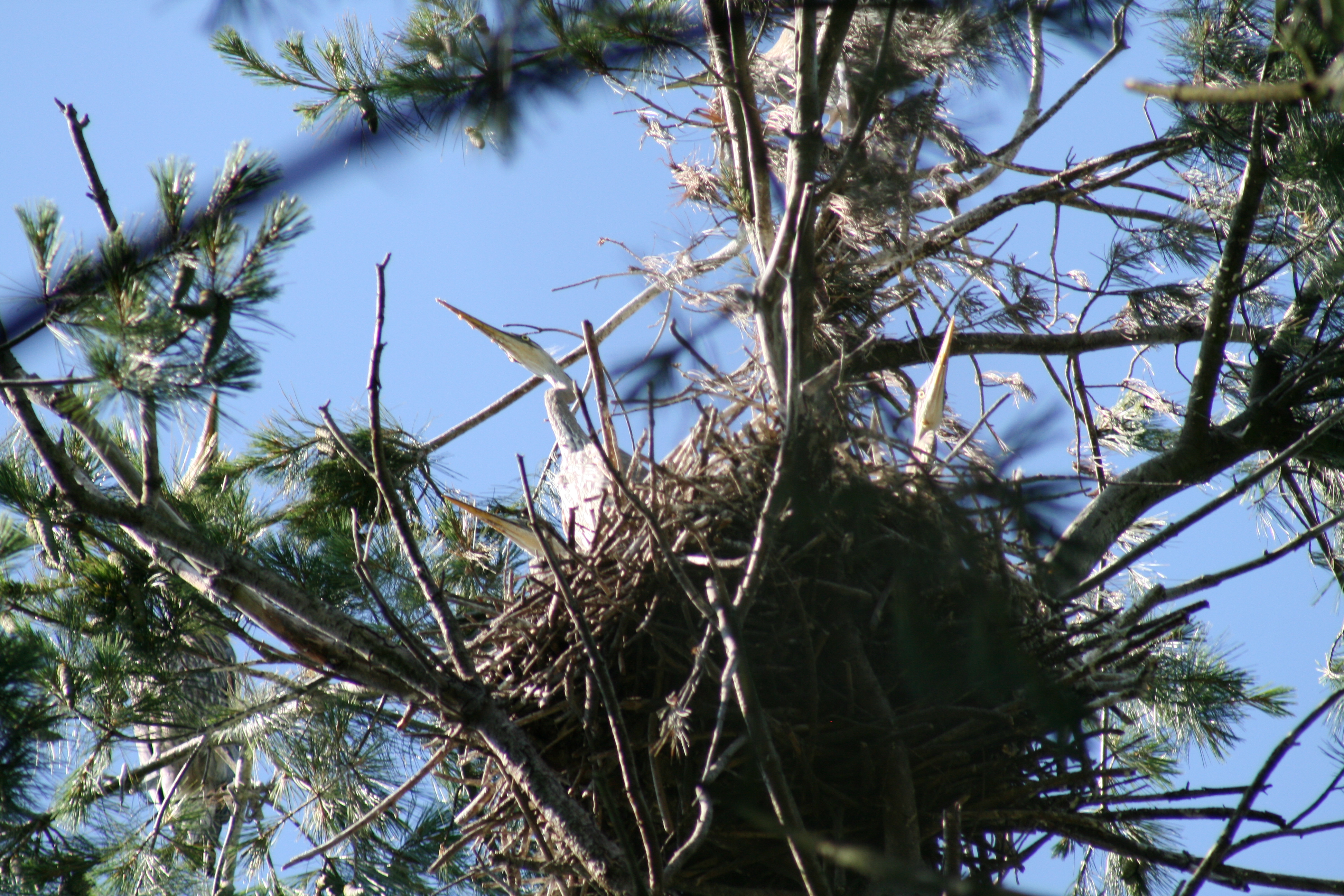 Great Blues breed in colonies with 150 nests or more being quite common. They nest high in trees and build large stick nests. The nest may be reused for several years, increasing in size each year. Herons lay an average four eggs per nest. When the chicks are born, both parents take turns feeding them regurgitated food. Care should be taken to stay away from the nesting area. If the herons are disturbed too often, the entire colony may abandon their nests and relocate to another area.