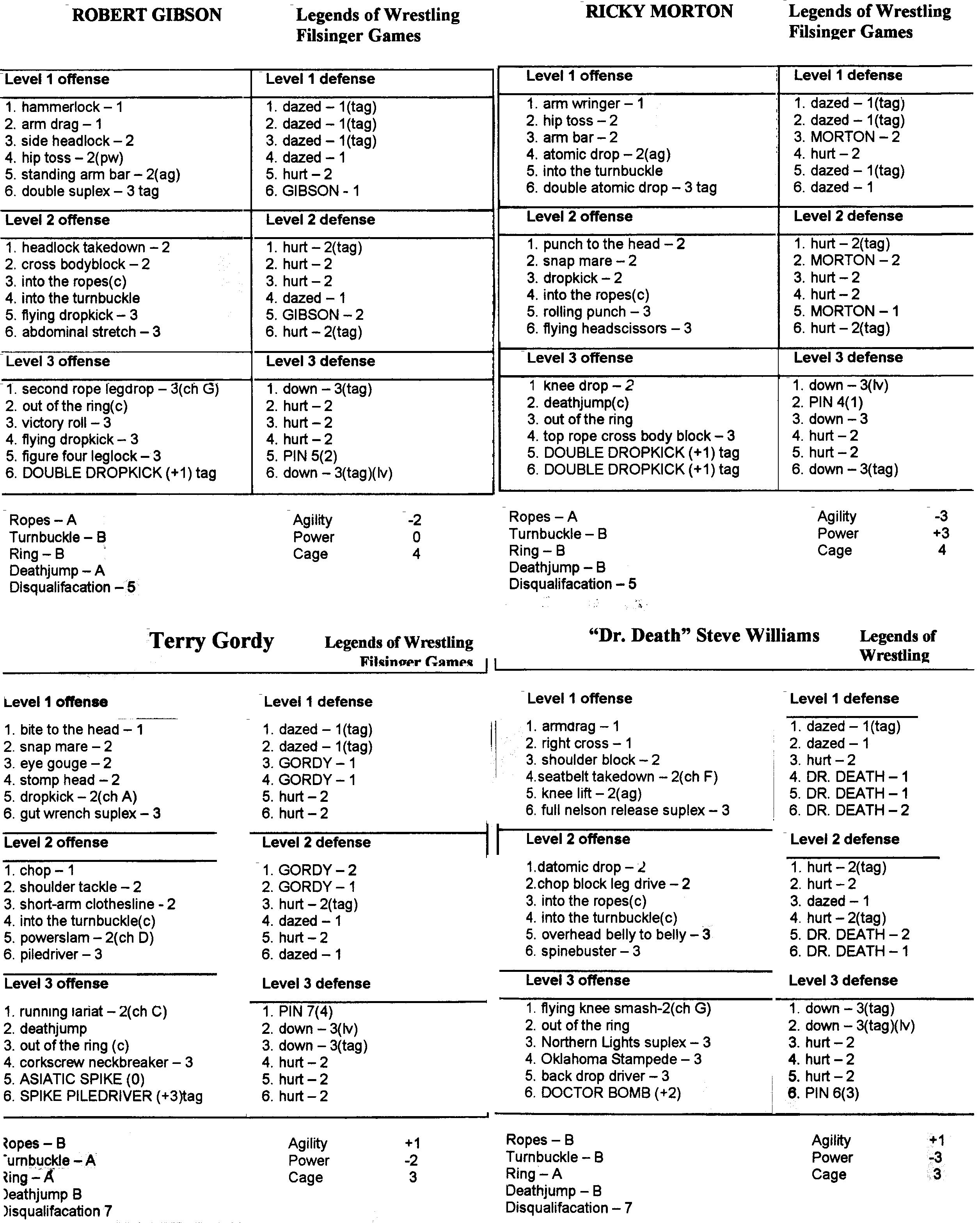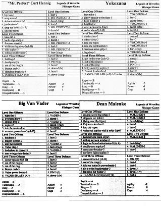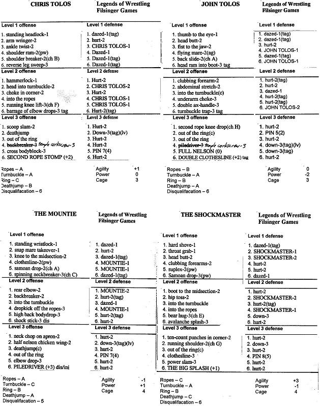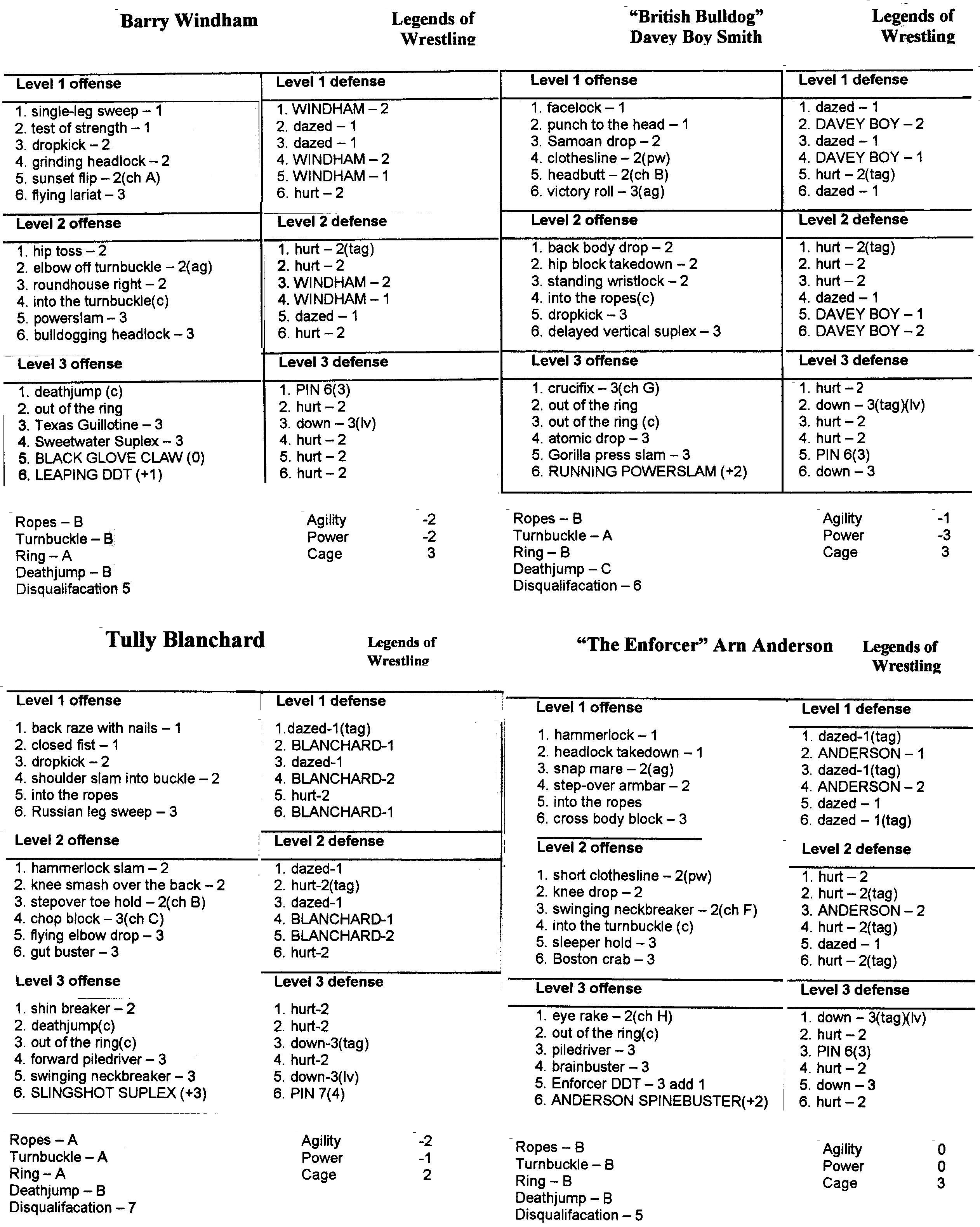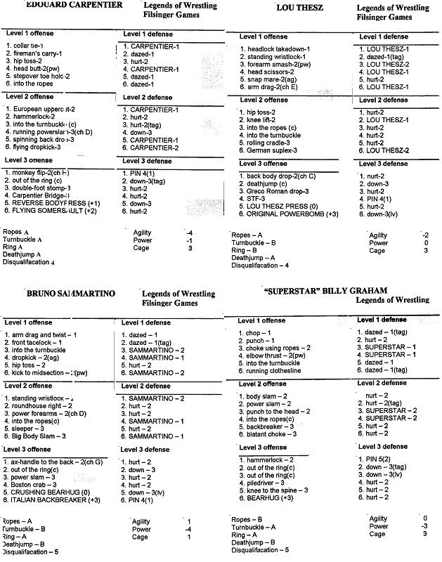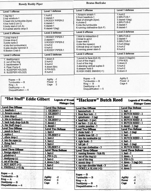 1.27.04 - Below are the templates that I used to cardstock my legends set of wrestler. There are 52 total, completing as my LWF evil promoter character calls my "deck of cards." They are NOT all my original work, I only put these templates up here to make it convenient for others to cardstock them. All of these stats were either borrowed from the list, from Mark Taggart's site, borrowed and tinkered to my own personal taste, or my own originals. All drawings were done by Mark Taggart, and I believe the photoshopped images of Butch Reed, Eddie Gilbert, and the Demolition were done by Brian Poynter and Bryan Mackerell. I originally wrote the stats on the "tables" feature of MS Word, and then switched over to Mark Taggart's stat template that is available on the Legends Yahoo! Group. I edited the remaining photos from various web sources.