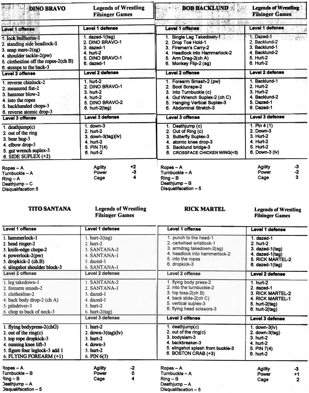 Template #6: Bob Backlund (circa 1980), Dino Bravo (circa 1989), Tito Santana (sans El Matador gimmick), Rick Martel (circa 1984) pics / stats