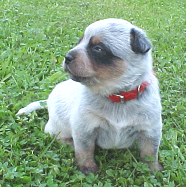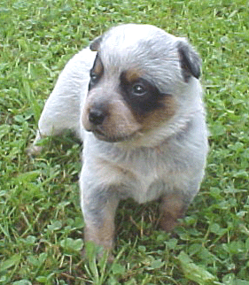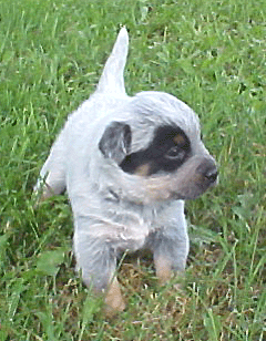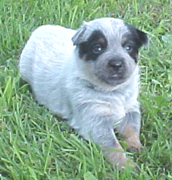 Pup F (SOLD) - A Full Masked Male - This pup's mask is asymetrical. His coloring includes a tan muzzle, tan "eyespots" (dots above the eyes, a common Heeler marking), dark tan from jowel across cheek, and tan on the lower legs. He was medium-to-large in size, with a long muzzle. His temperament was mild but he had a high energy level and was an "explorer." This independent nature may carry over as he becomes older. Since he did not mind being alone, he was an ideal candidate for an owner who has no other pets. Dogs with this disposition generally do not experience "separation anxiety" to a great degree when living with persons who must be away from home for a portion of the day (at work, etc.) Such pups usually take to "crate training" with little or no difficulty, often becoming very fond of their crate (a large wire cage that is initially used at night and when the owner is away as an aid in house-breaking a pup.) Some dogs enjoy having their own "den" and adopt their crate as their favorite sleeping place as adults (with the door open and a dog bed inside.) Many dogs with an independent nature have a relatively low "pack" instinct, which means that they can sometimes become "strong willed" adults, particularly if they also have very high intelligence. Such a dog has the ability to "think for himself," which can get him into mischief when left home alone with nothing to do. A strong-willed dog is not the ideal candidate for a family with very young children, or for an owner who has never previously raised a dog from a pup, because he may need firm handling and obedience training. However, this pup's behavior was not dominant within the litter, and he was not a vocal pup, which indicated that he could develop a relatively "laid back" attitude as an adult. (This pup had the same combination of personality traits as his sire -- a dog with this high-energy, high-intelligence personality is a quick learner, always willing to learn new fun things to do with his owner.)