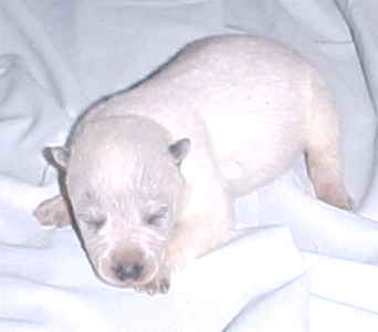 Pup A (SOLD) - A Female with a full mask. This pup is large-sized and has a sturdy build. At 1 week of age, she was a contented pup and not vocal when picked up and handled. At 7 weeks of age, she is secure in her "order" within the litter. She is a strong dog and one of the "leaders" within the litter. She is an independent pup and enjoys exploring her environment, but she is also affectionate when picked up or petted. She is beginning to understand the command "sit," and she looks into a person's eyes when spoken to.