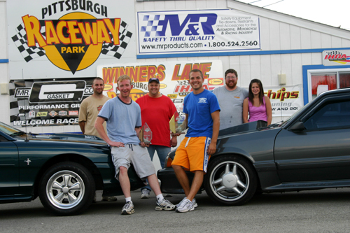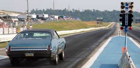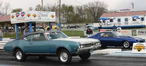 September 18, King of the Street race, Mike Egan on the left goes .002 red, while Mike Balaska, right, goes .003 green. Crazy Joe Devola, Barry, Chuck, and Nicki are in the background.
