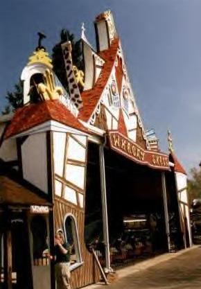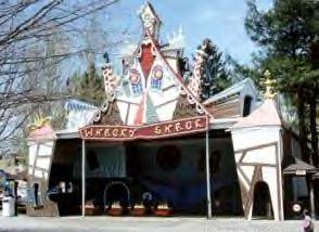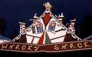 The WHACKY SHACK at Waldameer Park, Erie, Pennsylvania, is a classic example of a BILL TRACY designed ride. Waldameer wanted to replace an earlier Dark Ride, the Pretzel built "Fun-In-The-Dark", an early series of rides the company did in many places including Coney Island and Bertrand Island. Both William Cassidy’s Pretzel Ride Company and Mr. Tracy bid to build the new ride, with Tracy winning and creating another one of his popular rides, possibly utilizing the "Hush-Puppy" ride car system. The WHACKY SHACK was one of three of Mr. Tracy’s most popular and haunting fronts, the others being his "Kooky Castle" and "Haunted House" facades. This is a classic Tracy design, and a later work in his career, being built between 1970 and 1971. Other examples of Tracy’s work along with his association with the Messmore and Damon Company would be built on several New Jersey Piers and in amusement parks from Maine to Florida, and all the way west to Kansas. About a dozen or so of his twisted and demented, yet gracefully made rides are still in existence. The WHACKY SHACK ride still remains a favorite among Haunted House enthusiasts.
