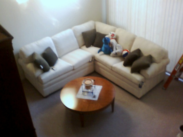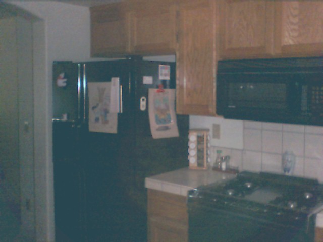 This is a picture of James' kitchen. Note the pictures from Rochelle and Dacoda on the refrigerator. Rochelle and Dacoda colored some pictures for their Uncle James. | This is a picture of James' living room. The home is multi-level and the living room has cathederal ceilings. |