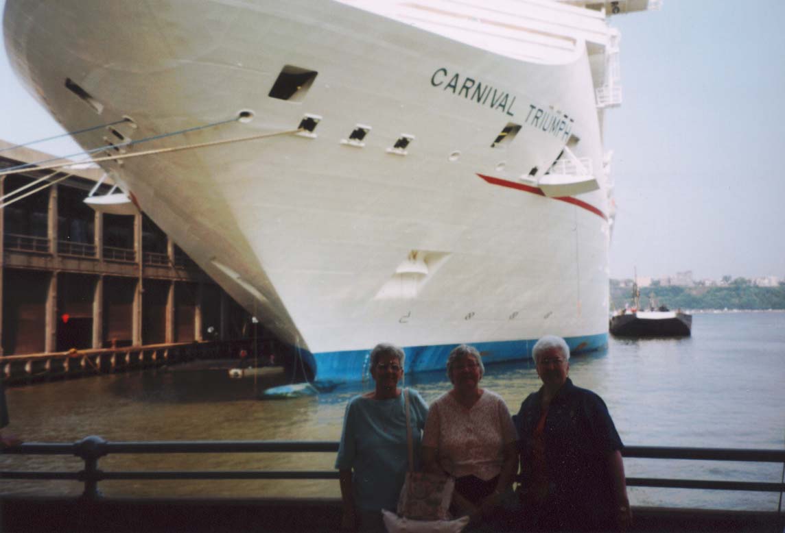 Mom went along (as Mr. DeHass's assistant in the library for 26 years, she knew all of the students from Susquenita). She is standing here on the Port of New York with Shirley DiPaolo and her friend. The Carnival Triumph is in the background.