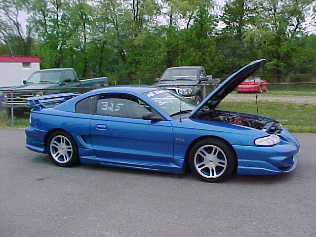 This is my friend Charlie's INCREADIBLE 95 GT Convertible AODE. It ran 12.9 at 105 NA with AFR's, FTI blower cam, e-brock intake and that's with the auto!!! It now sports a polished Vortech S trim under the hood!!! It has PMP lambo doors, '00 cobra R front fascia, SVO side exhaust, ABC exclusive GTR rear bumper, custom two tone seats, custom paint job with ford grey metalic on top, ford oxford white and bottom, and a Dupont Chromolusion stripe seperating the two. Everything under the hood is polished too!!! Its a real show stopper. If you want to ask Charlie more about his car, here's his email address... drago1@adelphia.net.