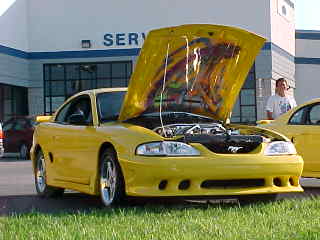 This is Mike's '01 Zinc yellow GT convertible. With nothing more than a cold air induction, offroad H pipe, 2 chamber flowmaster mufflers, 4.10 gears, and Nitto 275-45-17 drag radials he has run 13.83 at 99mph. It took me a lot more than that to run 13.8's!!! He also has '95 cobra wheels on it that I think look GREAT!!! Mike added an Autometer tach and a line lock to help with the track duties this coming year. He also just added 4.30 gears, pulleys, an eaton carrier and 31 spline strange axles.