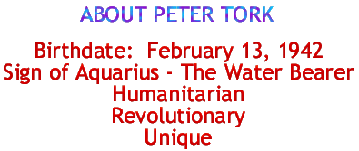 As a songwriter, the veteran artist contributed one of the greatest anthems of the '60s peace generation, the lovely but driving "For Pete's Sake." And although never a great vocalist by any stretch, Tork still managed to leave his imprint on the band with such distinctive turns on songs like "Shades of Gray," "Words," and "Can You Dig It."