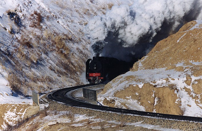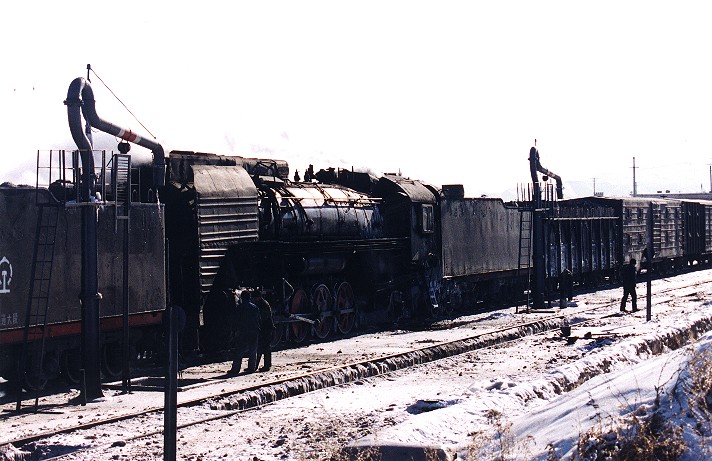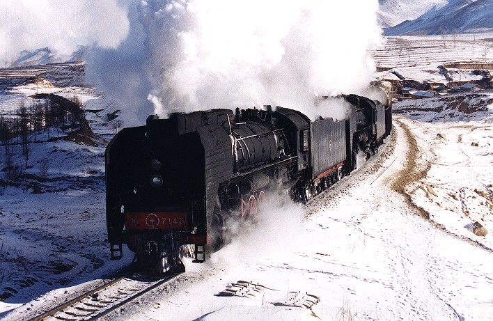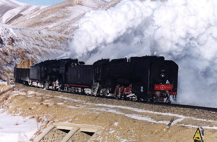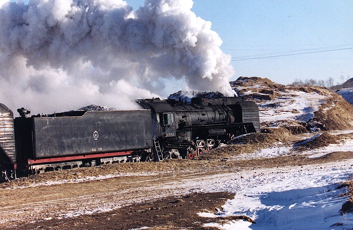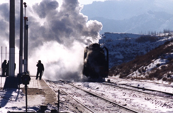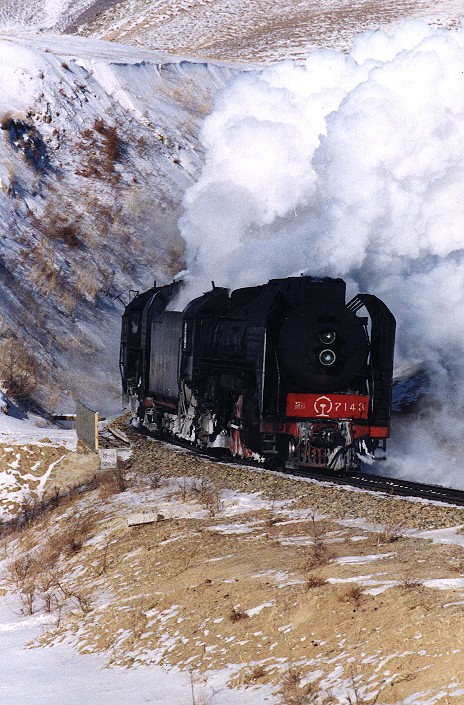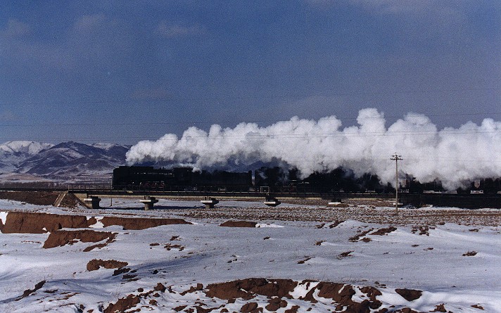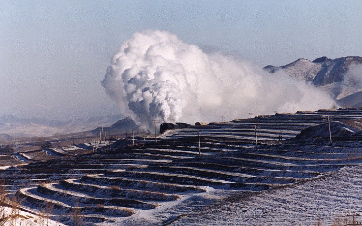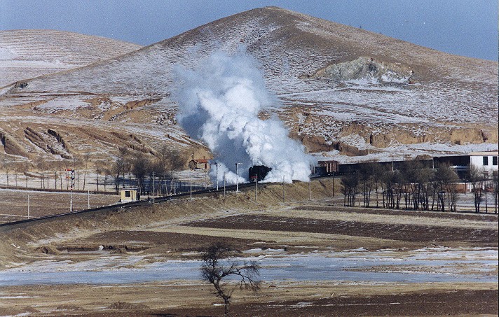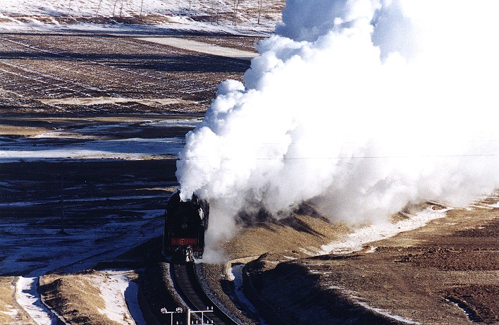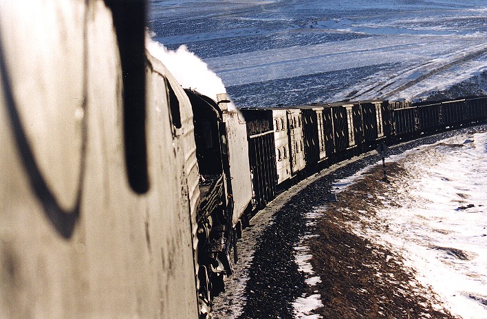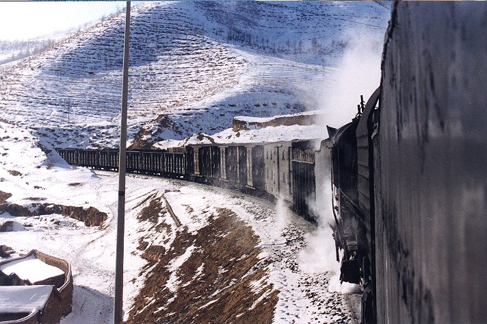The first few minutes at the pass presented me with a double header QJ class mixed freight train heading towards Jing Peng. The QJ class steam locomotives are massive 2-10-2 coal burners. All of the QJ's that work the Jing Peng pass have 12 wheel tenders. Most of the traffic on the Jing Peng pass serves the coalmines in the area, however a decent amount of the trains are mixed freights also. All of the trains I saw here were steam, no diesels in sight. The closest diesel I saw in fact was a DF4C near Chifeng. I never saw any other steam type in this area apart from QJ's. January 18, 1999 - Inner Mongolia, PRC.