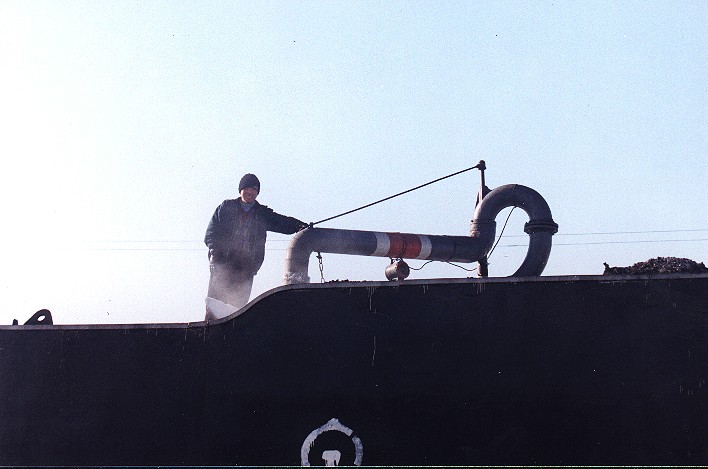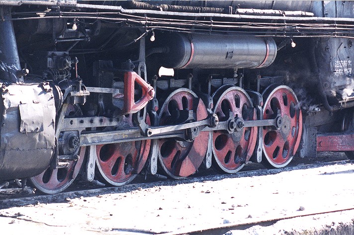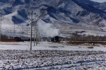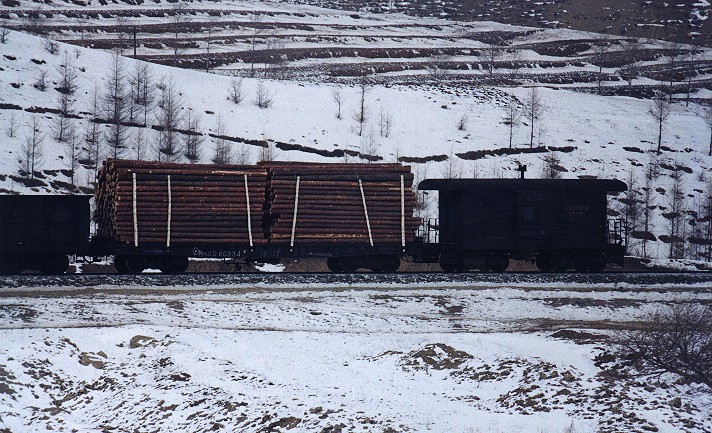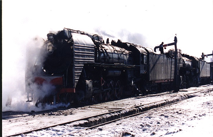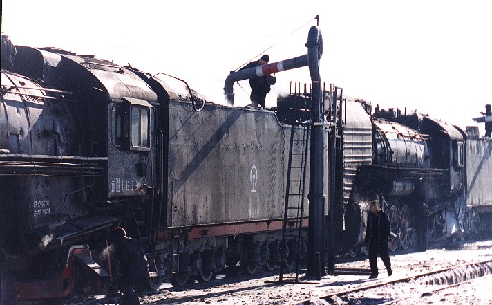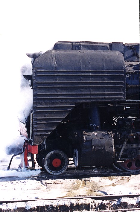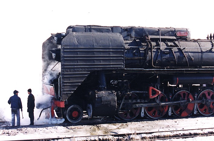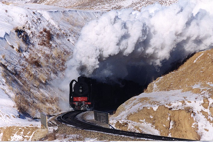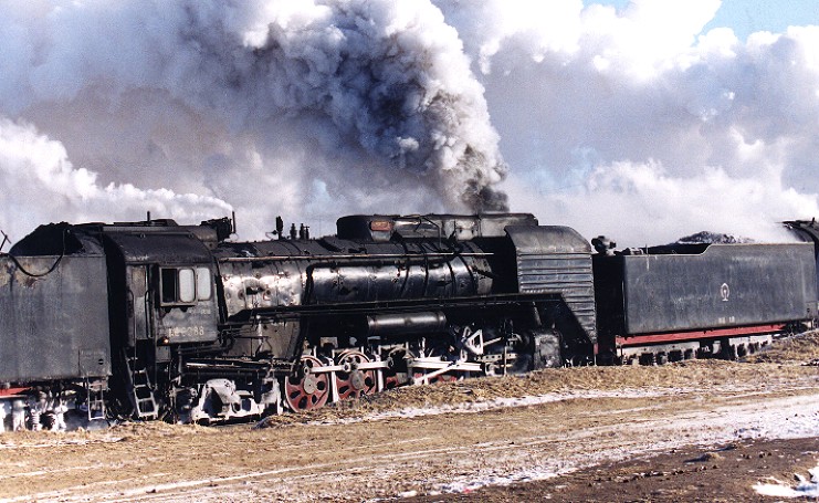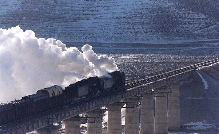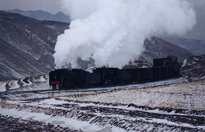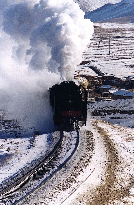The first few minutes at the pass presented me with a double header QJ class mixed freight train heading towards Jing Peng. The QJ class steam locomotives are massive 2-10-2 coal burners. All of the QJ's that work the Jing Peng pass have 12 wheel tenders. Most of the traffic on the Jing Peng pass serves the coalmines in the area, however a decent amount of the trains are mixed freights also. All of the trains I saw here were steam, no diesels in sight. The closest diesel I saw in fact was a DF4C near Chifeng. I never saw any other steam type in this area apart from QJ's. January 18, 1999 - Inner Mongolia, PRC.