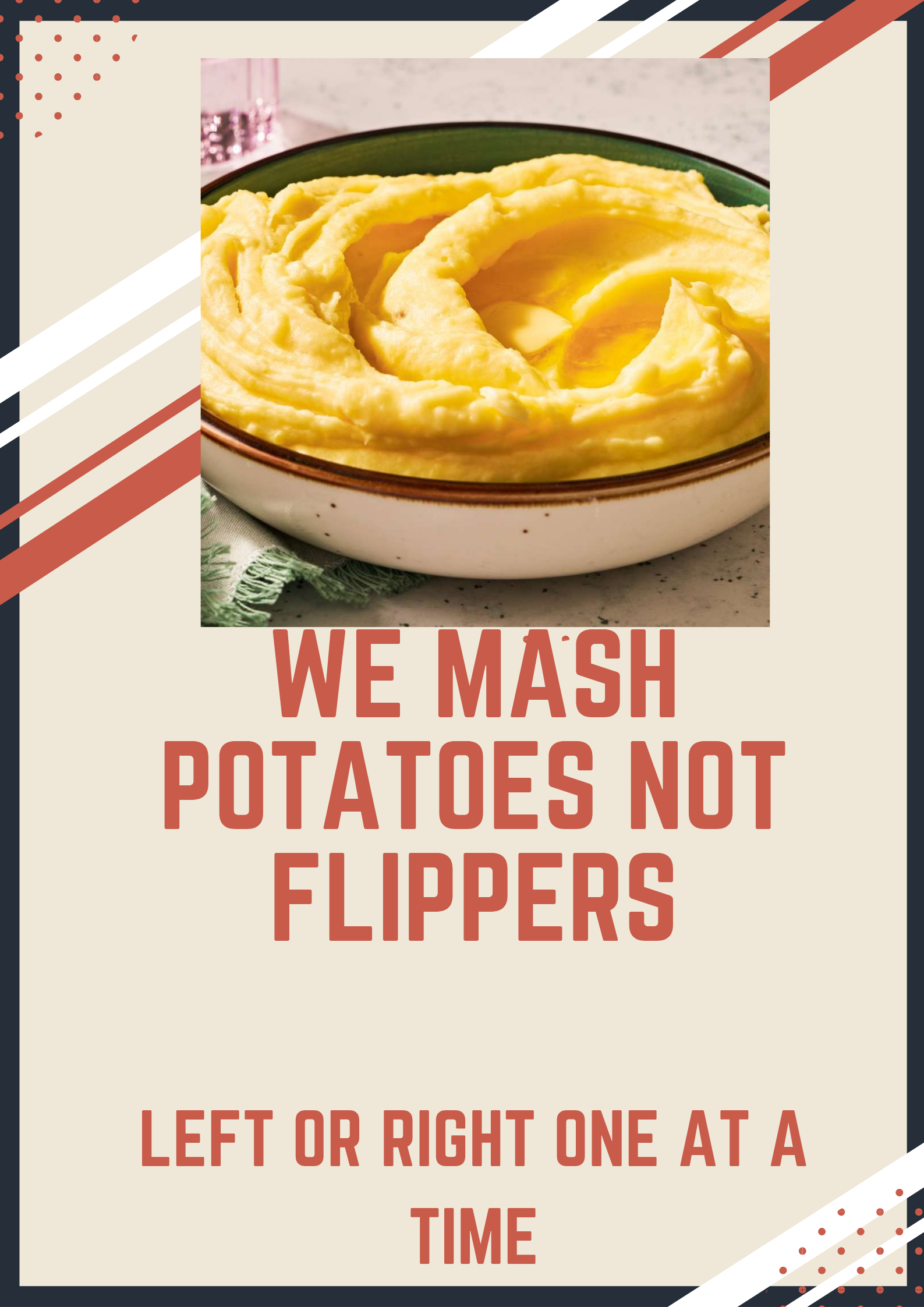 WE MASH POTATOES NOT FLIPPERS. LEFT OR RIGHT ONE FLIPPER AT AT TIME, LIKE BASEBALL