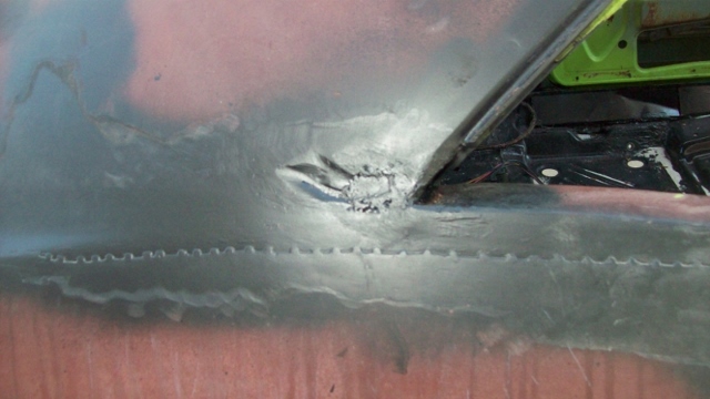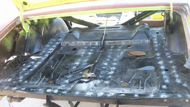 Someone decided to weld in a home made trunk floor. Here I am cutting it out to get to the factory trunk floor underneath. A lot of rust between the 2 layers. A lot of work to get it cut out!!!