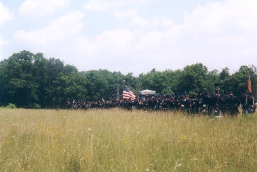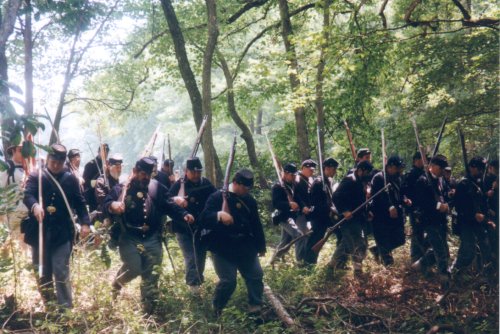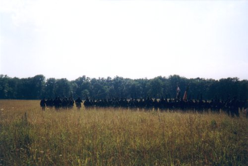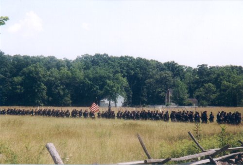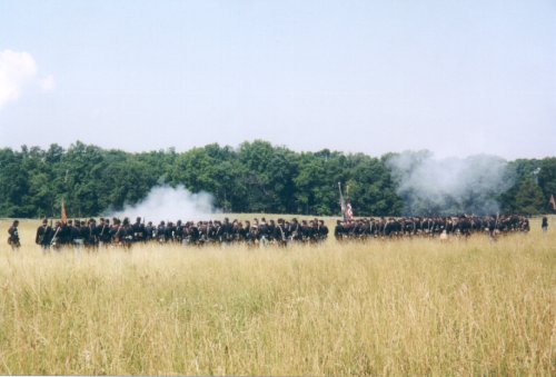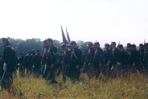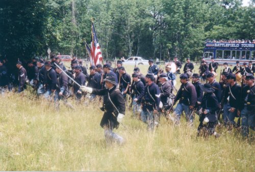 Responding to an invitation from the National Park Service, the Mifflin Guard (including Co. K, 81st PVI) presented a two-day encampment on the grounds of Gettysburg National Military Park on July 1st & 2nd, 2000 to commemorate the anniversary of the battle. In addition to daily demonstrations of camp life, tactical drilling, marching and firing, the Guard participated in the ranger tour "Brig. Gen. Caldwell in the Wheatfield", which was broadcast on Pennsylvania Cable Network, and a portrayal of the charge of the 1st Minnesota. The ranger tour depicting the Wheatfield had special meaning to the 81st, Co. K reenactors because the original 81st PA fought in the Wheatfield. The encampment and demos drew large crowds all weekend and was enjoyed by the reenactors as well.