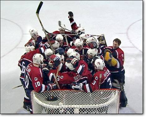 AJ slams his stick onto the ground as the Canadian players run onto the ice and grab onto each other in celebration. AJ skates over to his fellow teammates as Jeremy Roenick puts an arm around him and shakes his shoulders.