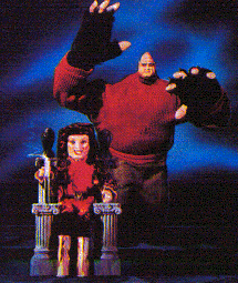 Pinhead's appearance fits his namesake. Here is a massive body with hands strong enough to snap bones and a tiny plastic head a little larger than a grape. By the way, did you know Pinheads puppeteer is a woman? Those hands you see mauling unsuspecting victims are actually those of a lady! Bet ya didn't know that! Pinhead also is always seen in a maroon sweater and a pair of slacks. He also wears gloves with the fingers cut out. Surely, it makes him look tough, even when he's in his cuddly mood. His appearance may also be a good reason for his endurance...he has survived almost every brutal attack. I've not seen another puppet eat the wall or floor as much as Pinhead. He is most definately a very important member of Toulon's puppets and very well-loved by all he befriends.