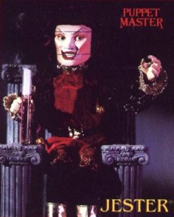 Yes, his moods. You can't mistake them! Jester has a paneled face which spins about until a mood is found. He has a frown, a sly smile, and a surprized or frightened face. And his attire consists of a conicle cap with bells attatched. You can hear the bells in the original Puppet Master. His top is like velvet or felt, with black slim pants and golden boots. His belt has a buckle that is either tragedy {the frowning mask} or comedy {the smiling mask}.