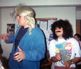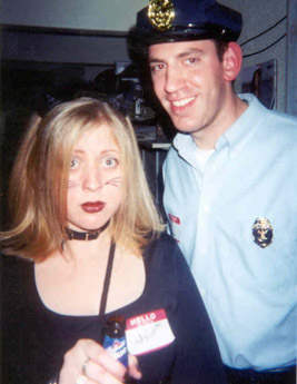 Jes and I went to Syracuse for a Halloween party. I was Slutty Cat(tm) while Jes was Princess Ghetto (due to the fact that her costume consisted of a shirt that said "princess" and sequinned pants that were about 4" too short). My friend Kevin, whom we were visiting went as "Oates" of Hall and Oates fame while his roommate Joe went as "Hall." The wig "Hall" is wearing is supposed to look like a mullet, but they couldn't get the snarl out. The cop isn't anyone I knew, but since I got a ticket on the way out, on top of all my other brushes with the law, I thought it would be a cute picture.