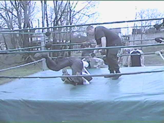 The first picture is of from me Vs. Wetzel Drake (HCW) - (One of our many Hardcore Matches) - he is delivering a baltimore city buster (Cryptonite Crunch) off the apron threw a table...... The Second is me getting powerbombed by XXX - which I didn't get up from for quite some time...... The 3rd is Debaser giving me a Debaser-Bomb right onto my upper back/neck - folding me in two (Notice over Debaser's right shoulder lies THE BIGGEST ASSHOLE EVER- TYGER)