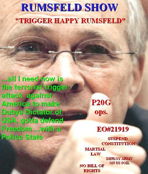Pentagon plans to attack America These plans seriously undermine the credibility of the US Federal Govt and the Secretary of Defense read excerpt 'According to a classified document prepared for Rumsfeld by his Defense Science Board, the new organization--the "Proactive, Preemptive Operations Group (P2OG)"--will carry out secret missions designed to "stimulate reactions" among terrorist groups, provoking them into committing violent acts which would then expose them to "counterattack" by U.S. forces. '. Let's remember the OPERATION CYCLONE (began in 1979) built the foundations of present-day Wahabi Muslim Terrorist network. . See more below with Zbig and Jimmy Carter and the Mujadeens. The Pentagon Plan to Provoke Terrorist Attacks by Chris Floyd (Counterpunch Magazine)- Friday November 01, 2002 Also follow up the trail with the keywords, Grey Fox,CIA,P20G and Proactive, Preemptive Operations Group . Be noted with Rumsfeld at the helm of the Dept of Defense we just can not be sure who should be feared more, whether the terrorists or Mr Rumsfeld and his plans to trigger the Coup D'etat he wants. How does Rumsfeld know so well and with the certitude of his exagerated overacting? Counterpunch Magazine: CounterPunch November 1, 2002 Into the Dark The Pentagon Plan to Provoke Terrorist Attacks by CHRIS FLOYD This age: layers of lime harden in the sick son's blood... There's nowhere to run from the tyrant-epoch... Who else will you kill? Who else glorify? What other lies will you invent? Osip Mandelshtam, "1 January 1924" . Front Page mag does not really object to achieve the Means to the End with P20G. To close today's edition on Grey Fox/P20GIs the US Federal Govt and the 'defense establishment' a terror organisation? I want to believe, but..... < Update 18th May 2003 The Real American Conservatives are dead set against the Imperial Neo-Conservative Statist war-rousers, here is what they think: Wolfowitz of Arabia. Jingoism for fun, profit and dictatorship at home, who me Wolfowitz and the Gang? Also visit Libertarian Conservatives Lew Rockewell and the Future of Freedom Foundation , where Free Thinking anti-statist live, excellent! A breath of fresh air for a change. The Patriot Acts as posted to Thomas in the Congressional Legislative Record. The document is 12 MG's, please use Download Manager to save it over several instances, it is free. Anyone remembers Pinochet using the Army on the civilians and calling it State of War> Well, the Rand Corp has published a book on using the US ARMY on US SOIL Preparing the U.S. Army for Homeland Security: Concepts, Issues, and Options Eric V. Larson, John E. Peters . The Rand Corp has the book available in pdf to download, get it before it is too late. Making Adolf and Stalin jealous http://www.epic.org/privacy/terrorism/usapatriot/. In Australia, the Federal Govt is following suit, trying to create the legal precedent of deployment see as follows here News Ltd: Army on new terror alert By Simon Kearney May 18, 2003 ABC-Army reserve expected to take counter-terrorism role Reservists to guard against terror attacks By SIMON KEARNEY 18may03 . If George and his gang of Pseudo-Conservatives were really honest on fighting Terror, they'd have shut down the Wahabists Madrassas in Pakistan and ejected the Al-Saud family, they haven't that leaves only one explaination and I think you know what it is: They are lying.