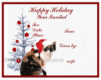 The cat Holiday invitations are printed on flat card stock with matte finish. Your information will be printed in "Times New Roman" in either red or black text. The invitation is 4 1/4 x 5 1/2 inchs. Minimum order of 10 invitation and 10 envelopes (1 set). Pricing is $1.80 each plus shipping charge. Standard shipping is $3.50 per