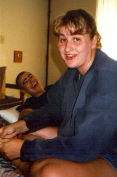 This is the situation that Courtni will be paying me back for until I die, maybe even after. Before we went on our trip to the beach, I asked her if a lesbian asked her out on a date while we were at the beach, would she go if I paid and made sure nothing happened to her. SHE SAID YES!! Armed with this information, I had to make sure one asked her out, just because Courtni wouldn't go back on her word. Our relationship was like that, put up or shut up and most times we both said or did things only because we dared each other and we both had too much pride to back down. Anyway, a week before we went to the beach, I put an ad in the "alternative lifestyles" personals, using Courtni's name-and within a day I had a response. A 58 year old gym teaching, motorcycle riding lesbian wanted to meet Courtni and show her around at the beach!! I could not wait to see Courtni's face when i told her she had a date with a lesbian!! I printed out all the responses that this lady sent to "Courtni", and I brought them along to the beach as proof that she really had a date because Courtni would have called me a liar. Well, we were in the hotel for maybe 20 minutes the first day and I just had to tell her what I did. For the next half hour, she called me a fucking bitch, nonstop. That was her name for me anyway, but she could not believe I did that to her!! It was THE FUNNIEST THING I ever did to her. When i took this picture, she was in the middle of saying "you fucking bitch." Nick was rolling off the bed with laughter, I had told him what I did and he too was waiting to see Courtni's reaction. Courtni always told me that she'd get me back for that, and I truly believe that even though she may be gone, she has not forgotten. I also think that she's been doing little things to me now and then.... And who am I to ever compete with who she has on her side now?