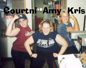 This night at work was so funny. I always go around talking like I've got the biggest, baddest muscles and I can kick anyone's ass. If you look at this picture, you'll see that Its so true...ok ha ha. I teased Amy and Courtni SO BAD, about the weird faces they made in this pic. Oh and also about why my muscle is so much bigger and more defined than theirs. Amy and Courtni would always end up in these horrible discussions about sex, and most times I just couldn't take it, it got so bad.