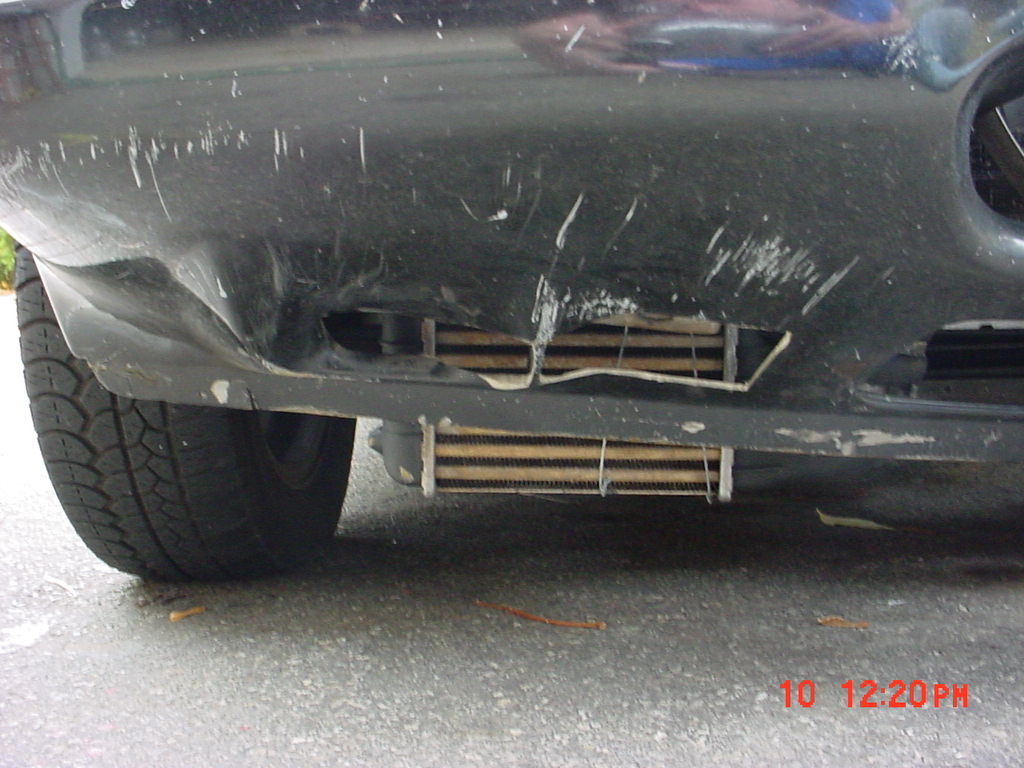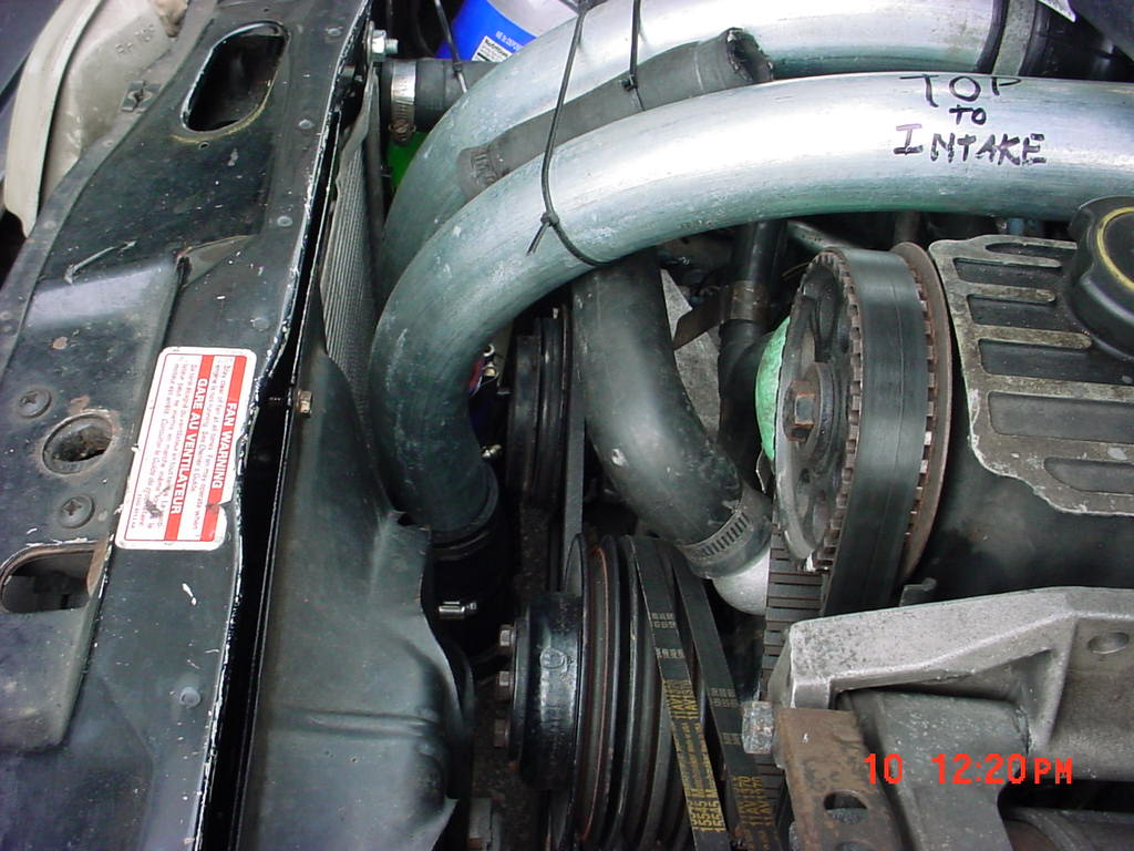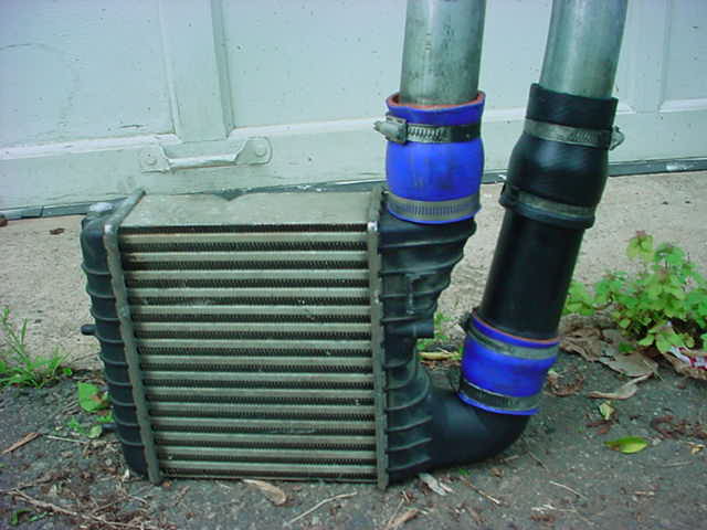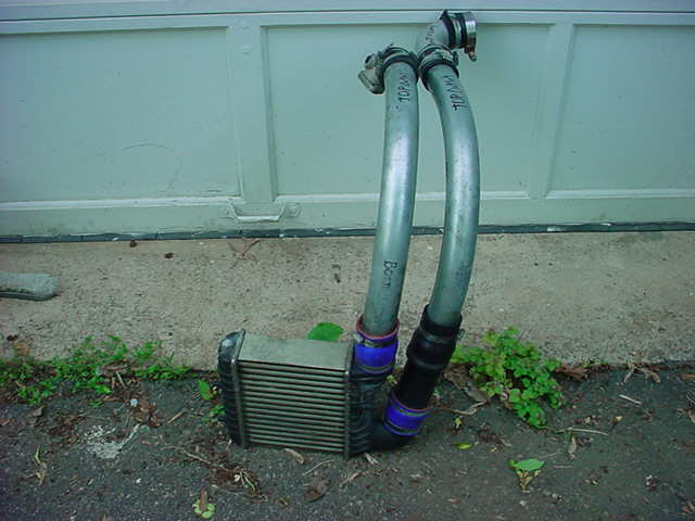 This is my setup which uses a Saab 900 IC. For this installation you will need to move or remove the stock radiator overflow tank that is next to the AC compressor and the charcoal canister. I used a bungee cord attached to the frame rail to hold the intercooler in place. It installs nicely because it has both connections on the same side. It does a great job of cooling. I run 20 lbs of boost with no detonation. And I still have AC. The pipes are from Lowes hardware. They are aluminum electrical conduit 90 degree pipes that are coated with something inside them that makes it feel like teflon, off the shelf items. Make sure you clean the inside of the pipes before installing, mine had paint inside them. You have to shorten one pipe to make it fit.You need to add one piece of straight pipe also. I had some Volvo IC piping around that I used to make that piece. The elbow for the intake is from a Saab or Volvo.