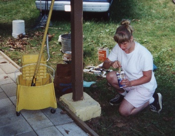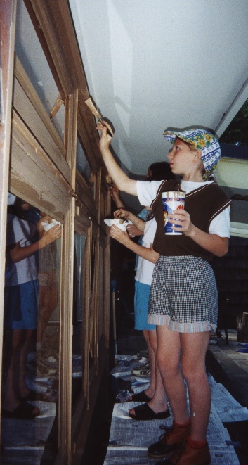 Painting the windowframe with a brown that's oddly lighter than the previous color!
