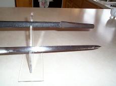 This sword is brass-hilted with a straight, double-edged, 25" blade tapering to a sharp point. A cross-section of the blade would be eliptical. Blade is unmarked and incredibly bright, with occaisional splotchy discoloration. There are a few tiny patches of surface rust on the lower half of the blade. No pitting or significant nicks on the edges.